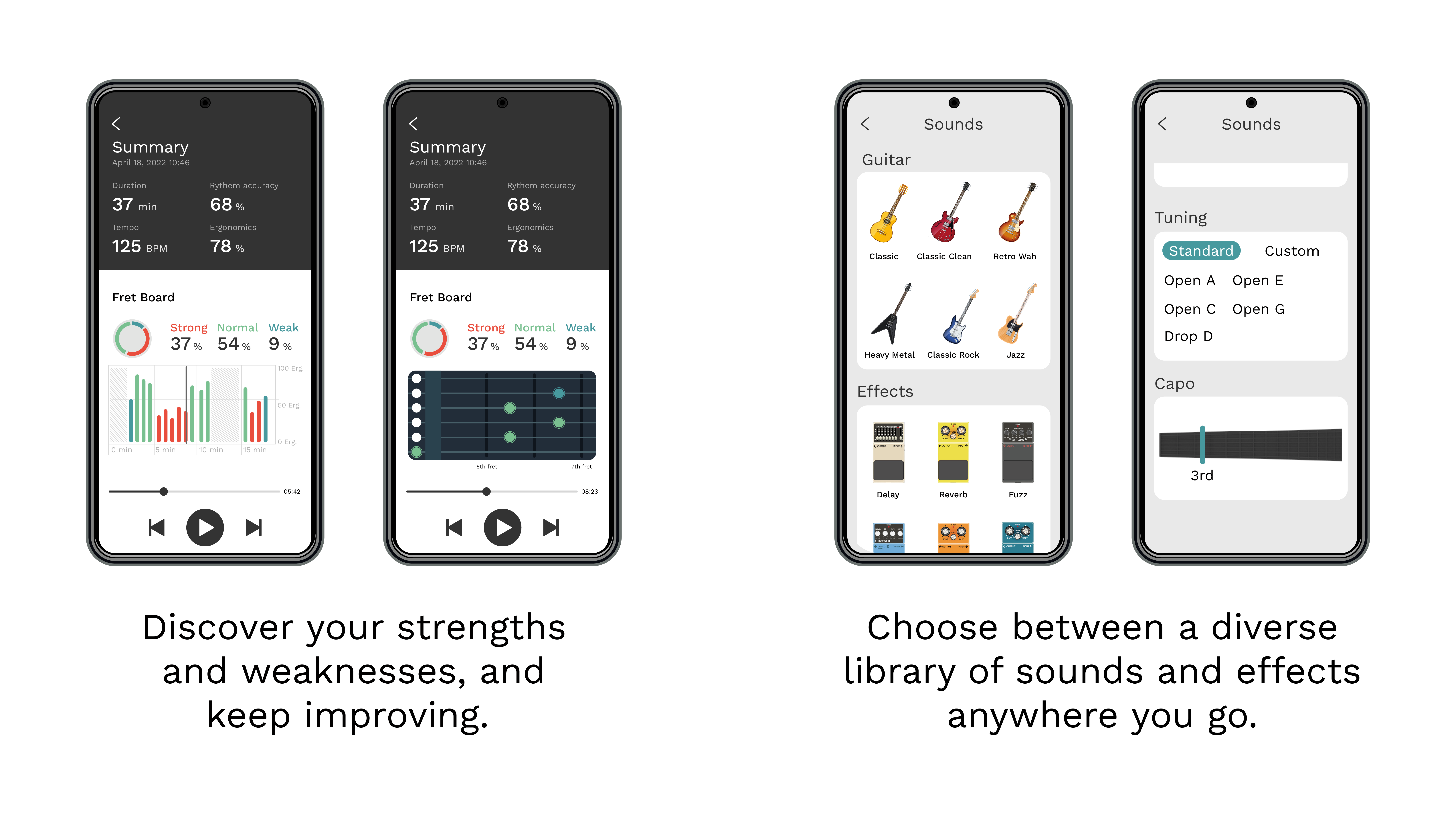 בנוסף לפיתוח של גוף הגיטרה פיתחתי אפליקציה שלאורך הנגינה עוקבת אחרי מספר פרמטרים כמו לחץ, קצב, אוריינטציה של הגוף ועוד. בסוף הנגינה האפליקציה תציג אנליזות וויזואליות בדומה לאפליקציות כושר וריצה. האנליזות חושפות לנגן הרגלים לא בריאים שיכולים להתפתח עם הזמן והנגן יוכל לשפר את אופן הנגינה בפעמים הבאות.