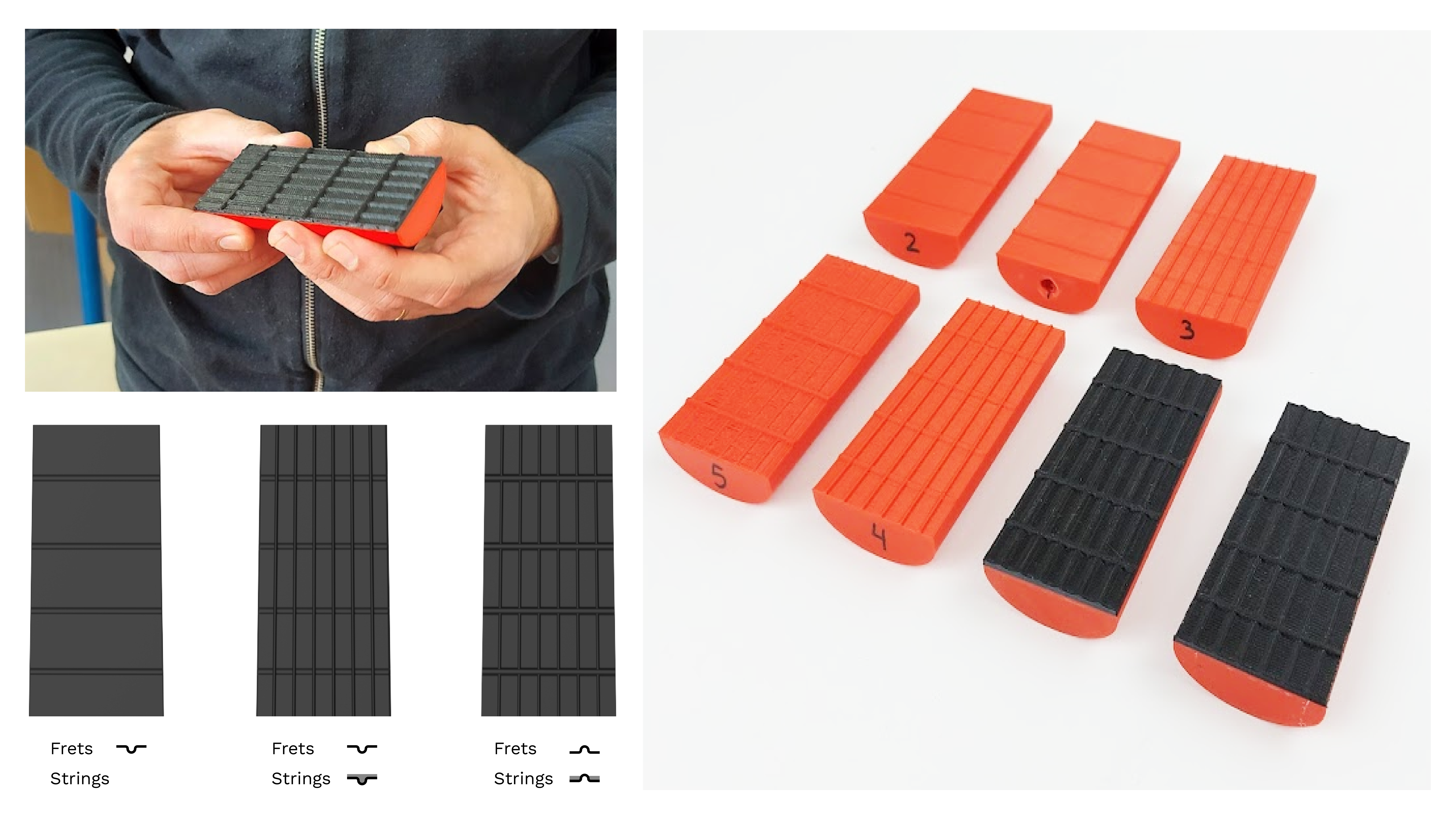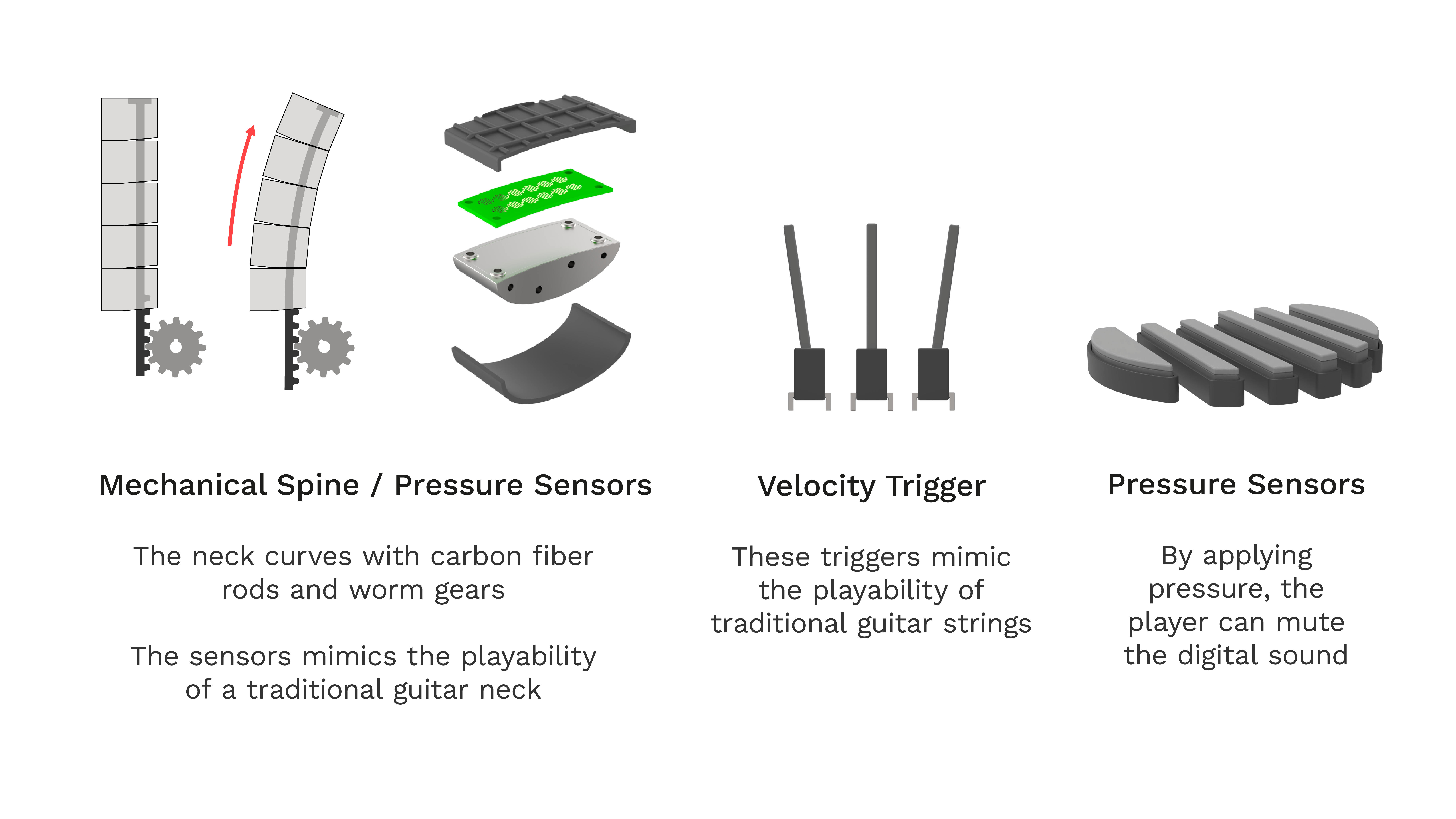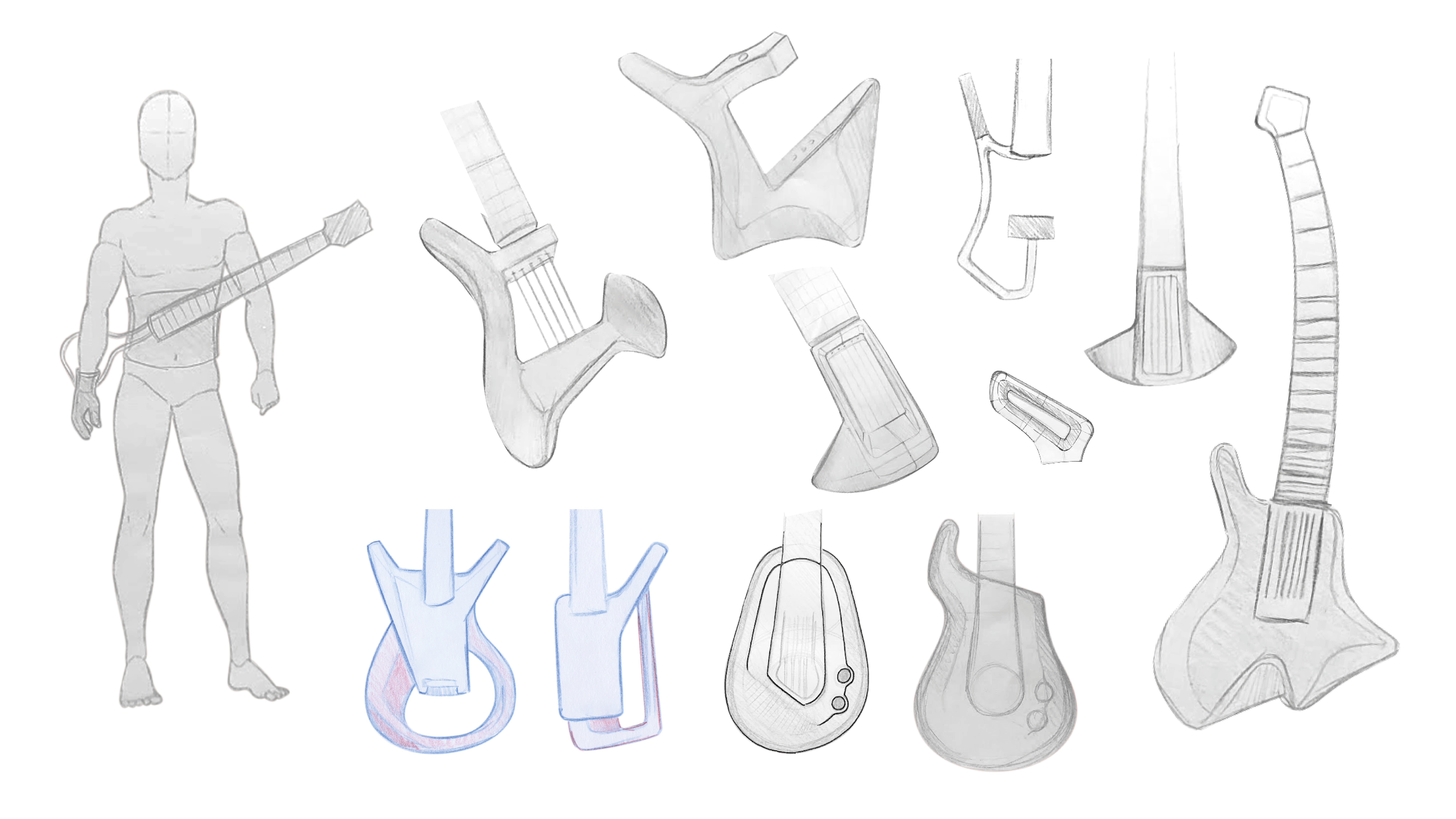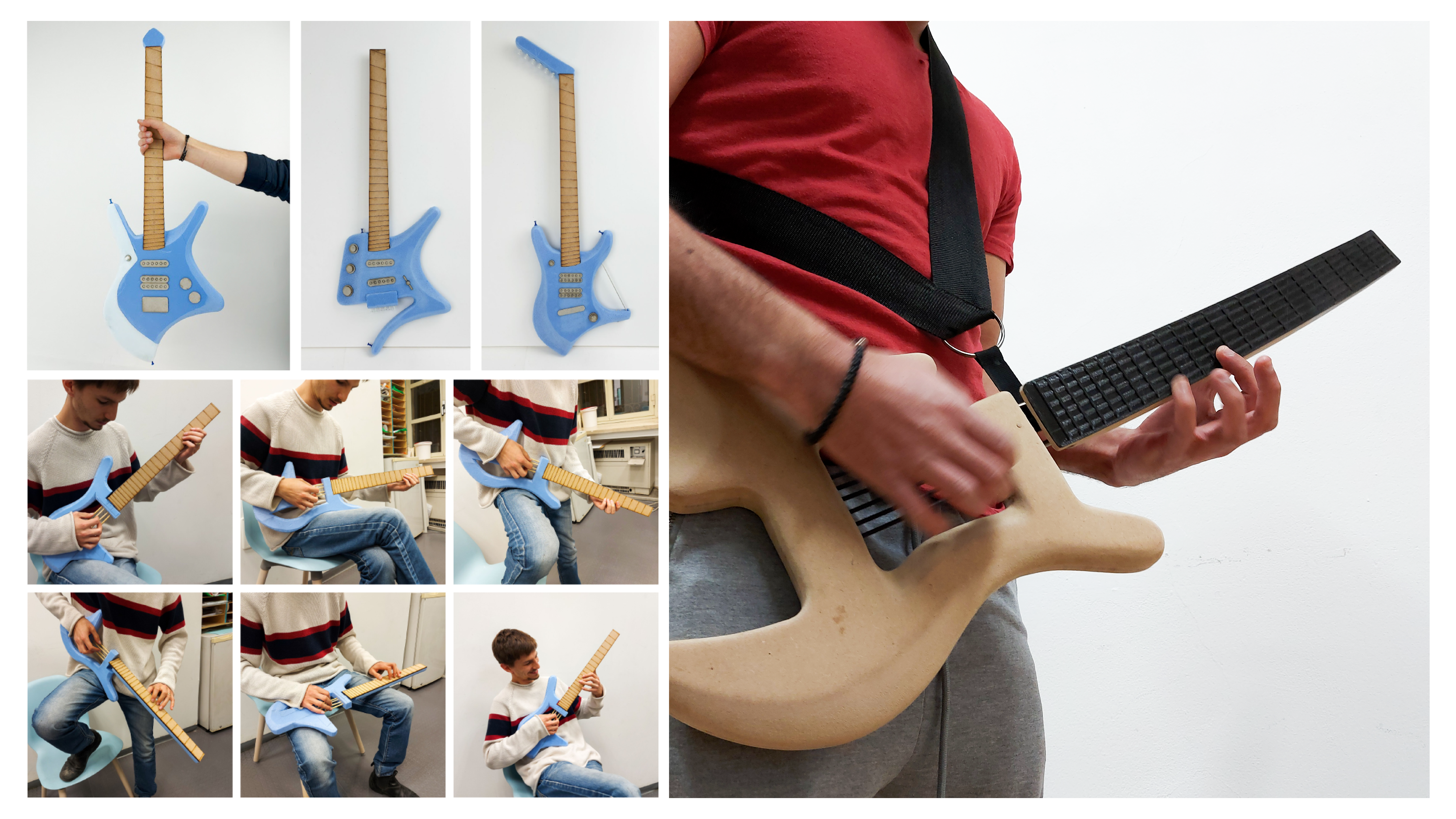 בתחילת הפרויקט היו מודלים מאוד שמרניים ולאחר ההבנה של טווחי התנועה של הנגנים הגיע הרעיון להמיר את הגיטרה לכלי דיגיטלי. המודל הראשון מתוך התהליך היה למקם את הצוואר של הגיטרה על ציר כדי לתת לנגנים מגוון מנחים שיוכלו לנגן בהם. היה חשוב להישאר עם תחושה טקטילית של גיטרה רגילה כך שהנגנים יוכלו לנגן על הכלי בצורה טבעית המוכרה להם, לכן היו לא מעט מודלים בשיתוף עם נגנים כדי שנוכל לדייק את הדמוי סריגים ומיתרים.