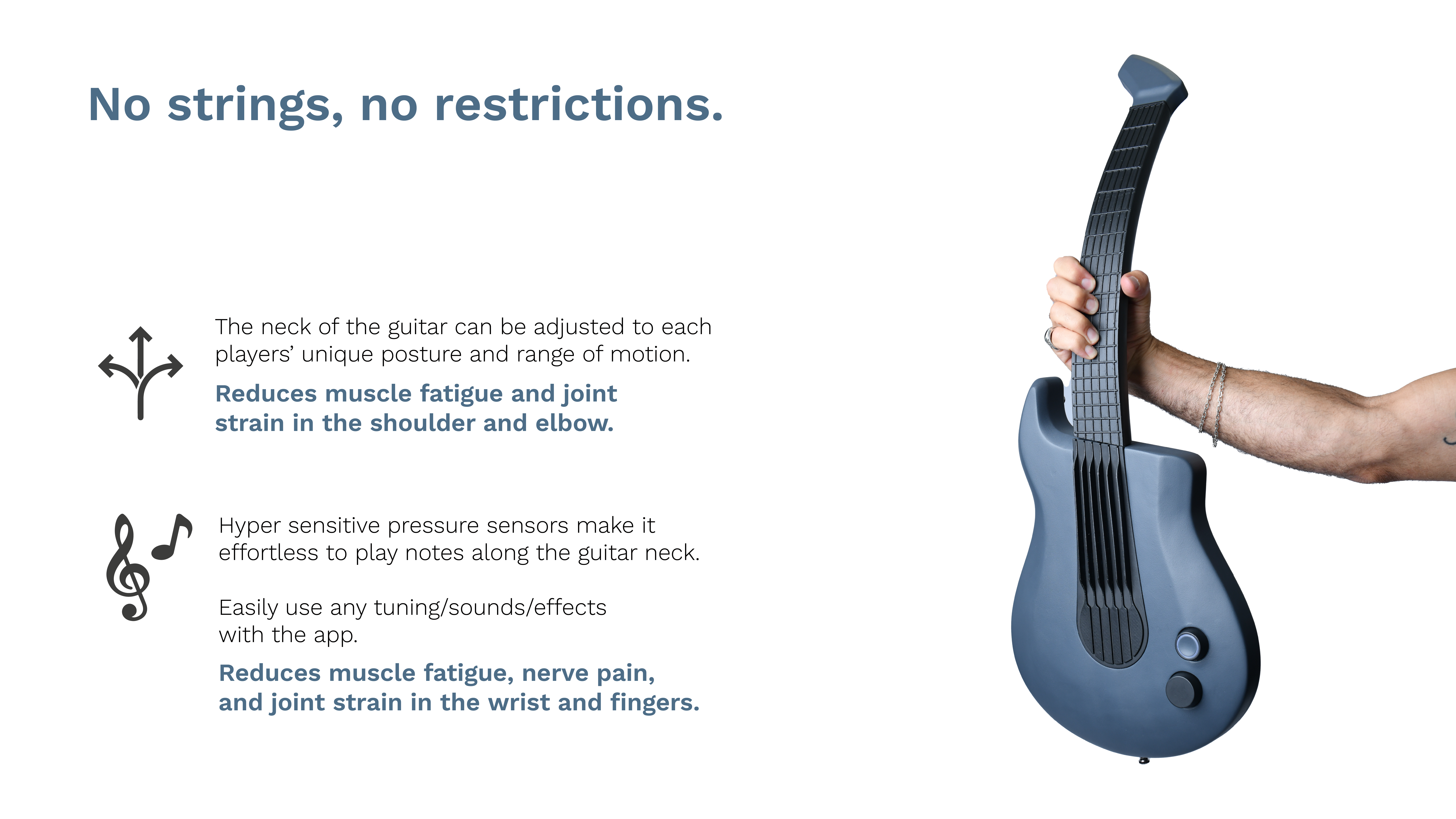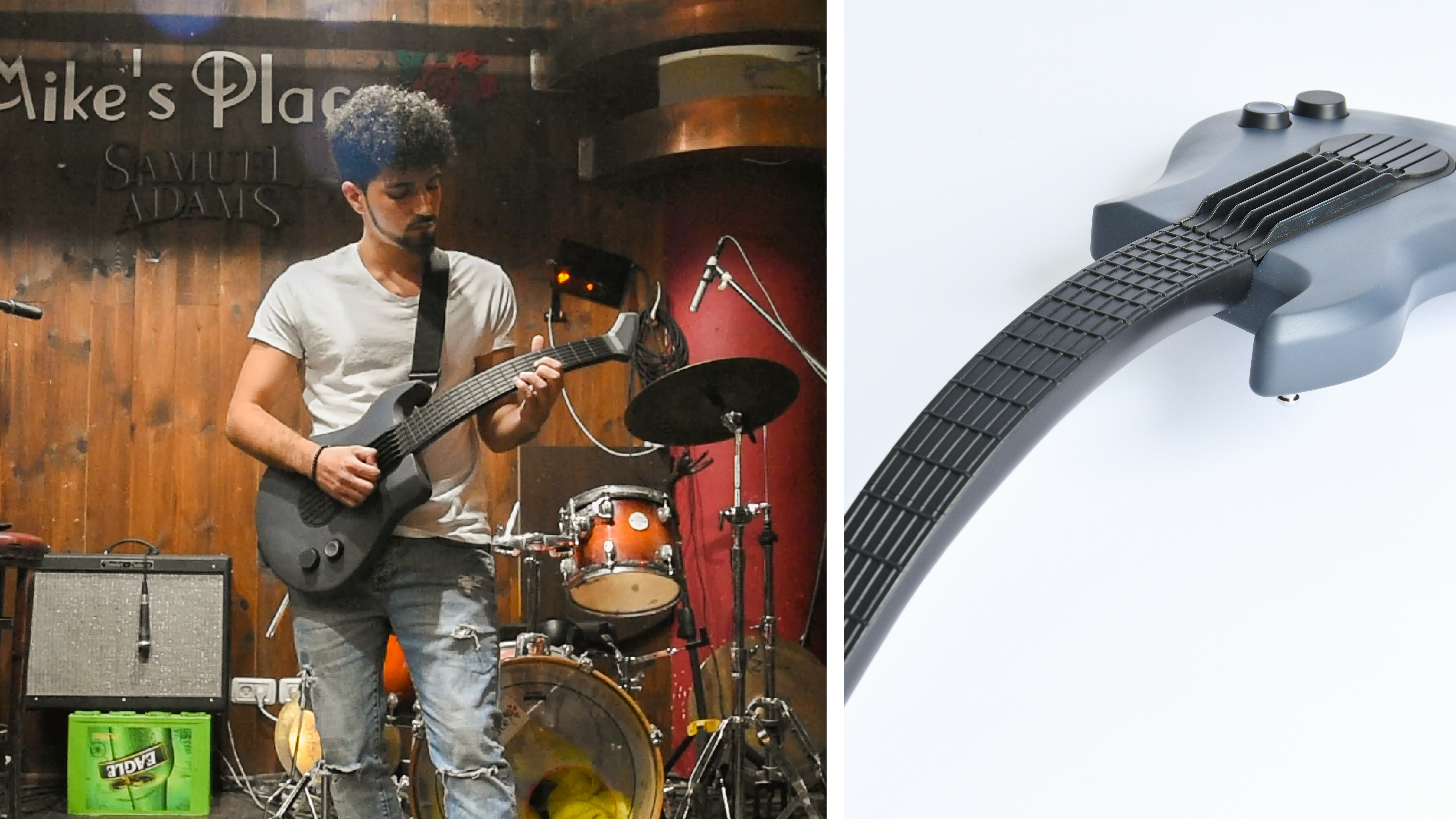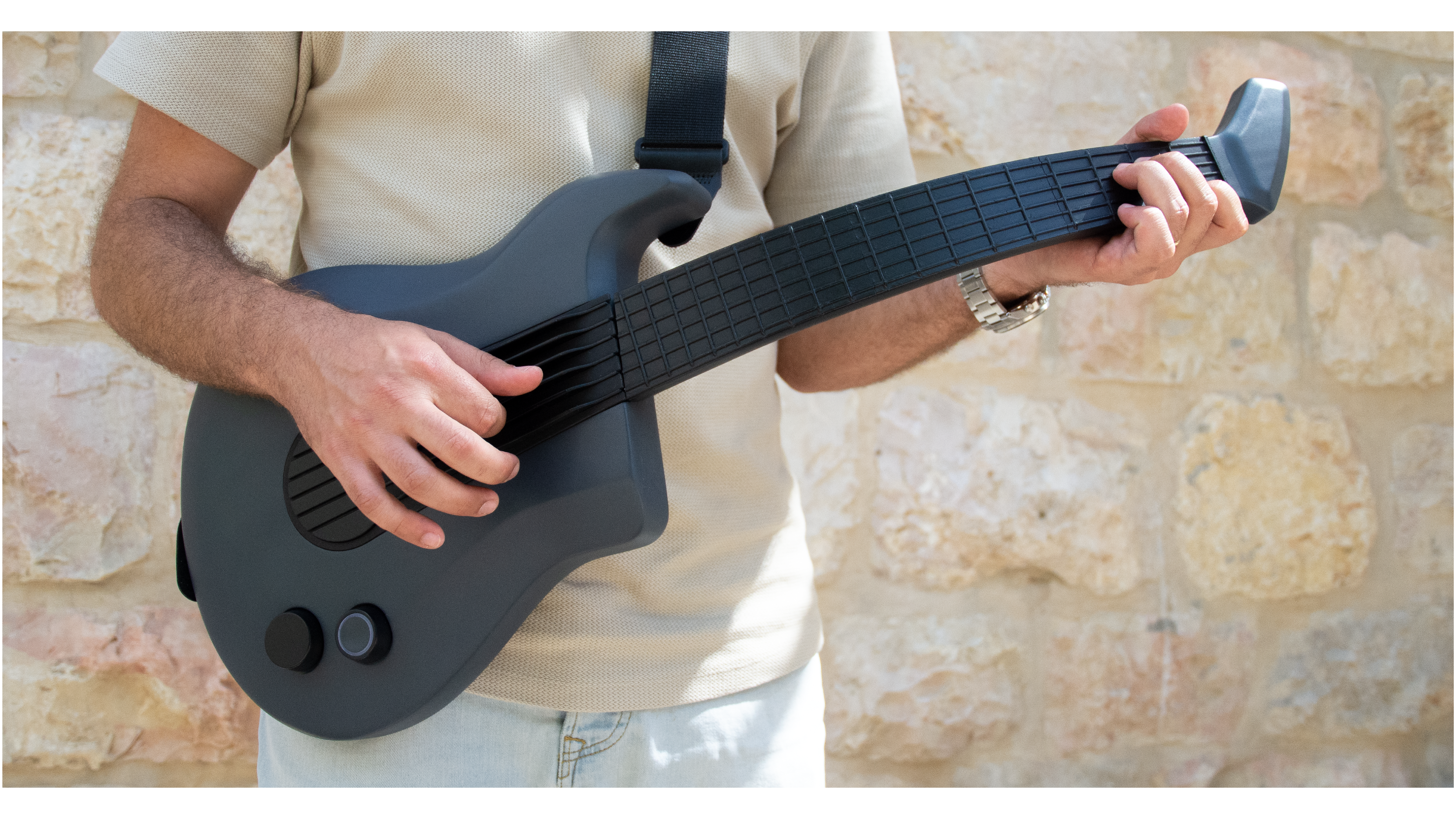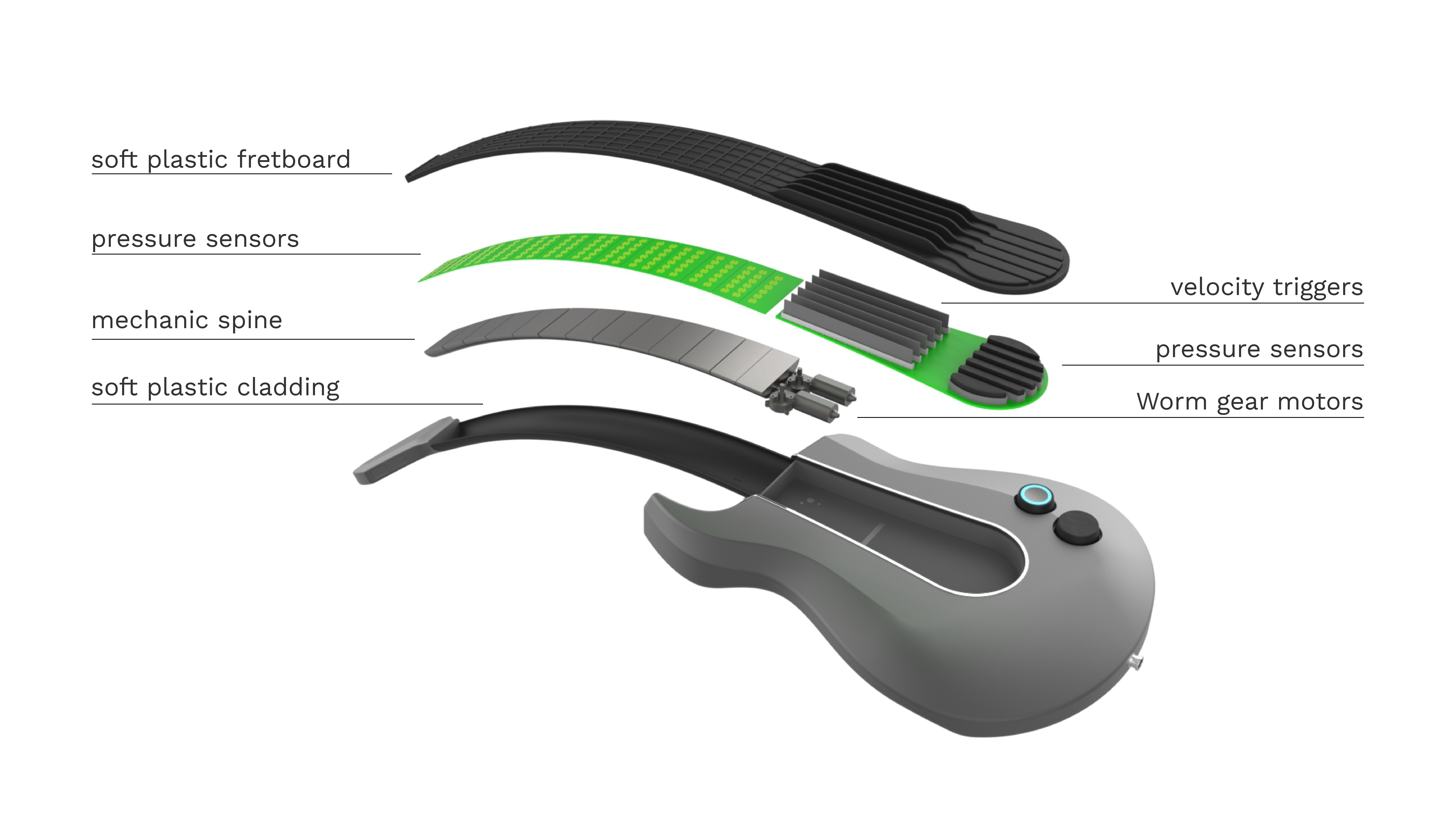 בתחילת הפרויקט היו מודלים מאוד שמרניים ולאחר ההבנה של טווחי התנועה של הנגנים הגיע הרעיון להמיר את הגיטרה לכלי דיגיטלי. המודל הראשון מתוך התהליך היה למקם את הצוואר של הגיטרה על ציר כדי לתת לנגנים מגוון מנחים שיוכלו לנגן בהם. היה חשוב להישאר עם תחושה טקטילית של גיטרה רגילה כך שהנגנים יוכלו לנגן על הכלי בצורה טבעית המוכרה להם, לכן היו לא מעט מודלים בשיתוף עם נגנים כדי שנוכל לדייק את הדמוי סריגים ומיתרים.