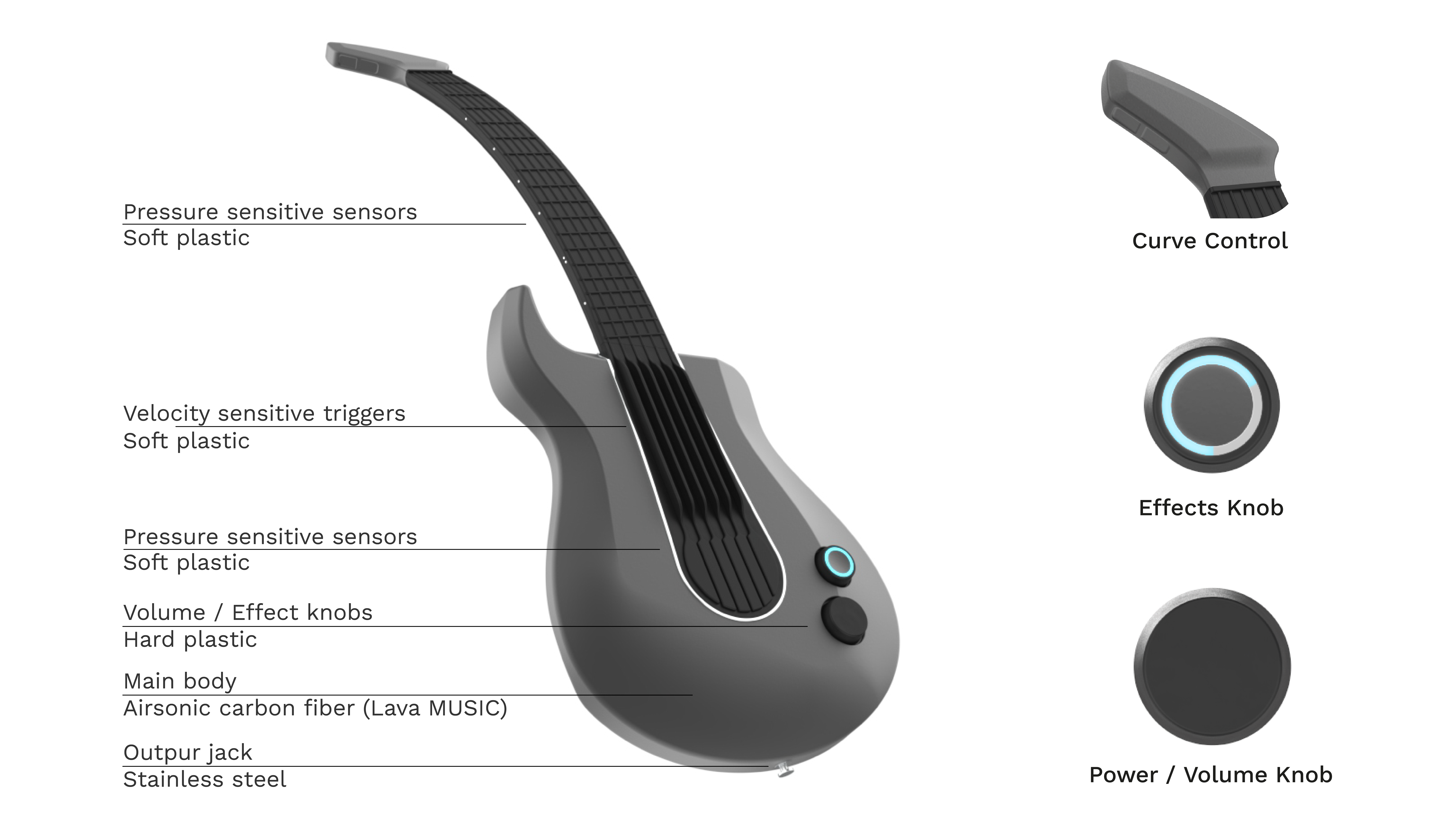 לאורך הצוואר מוטמנים סנסורי לחץ שאיתם מפיקים צלילים דיגיטליים. באזור הפריטה יש דמוי מיתרים שבתוכם יש מתגי VELOCITY שמטרתם לקלוט את עוצמת ההקשה של הפריטה - פריטה חזקה תפיק צליל יותר חזק. בהמשך למיתרים המדומים יש סנסורי לחץ שאיתם הנגן יכול לעצור את הצליל הדיגיטלי בדומה לגיטרה רגילה. גוף הגיטרה עשויה מקרבון פייבר שפיתחו חברת LAVA MUSIC במיוחד לגיטרות. הצוואר בנוי ממספר חוליות ומופעל על-ידי 2 מנועי Worm Gear. המנועים מושכים ומרפים מוטות בלב הצוואר ששולט ברמת הכיוונון. המנועים מקבעים את עצמם ברגע שיפסק זרם החשמל וכך גם מקבע את הצוואר.