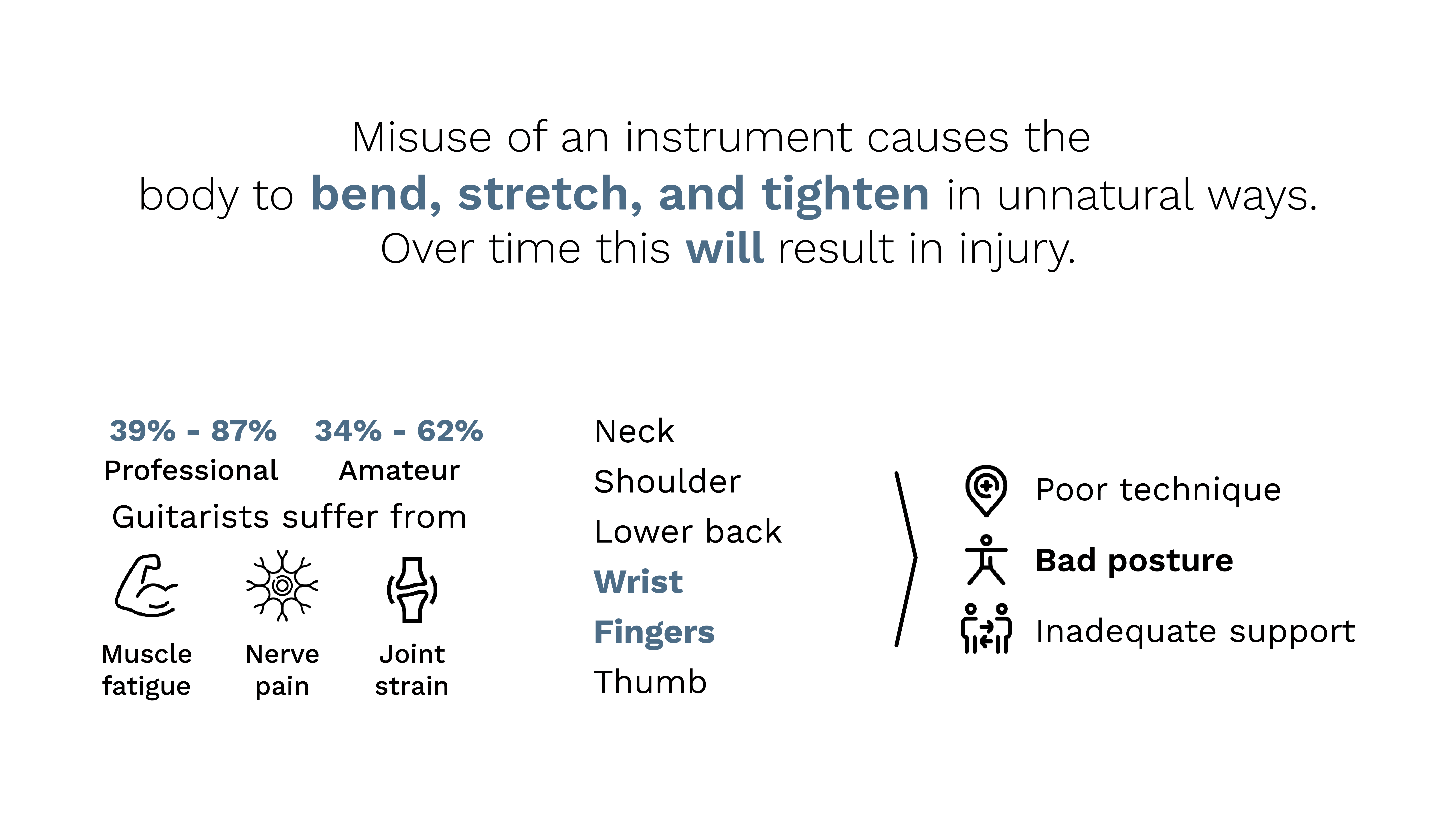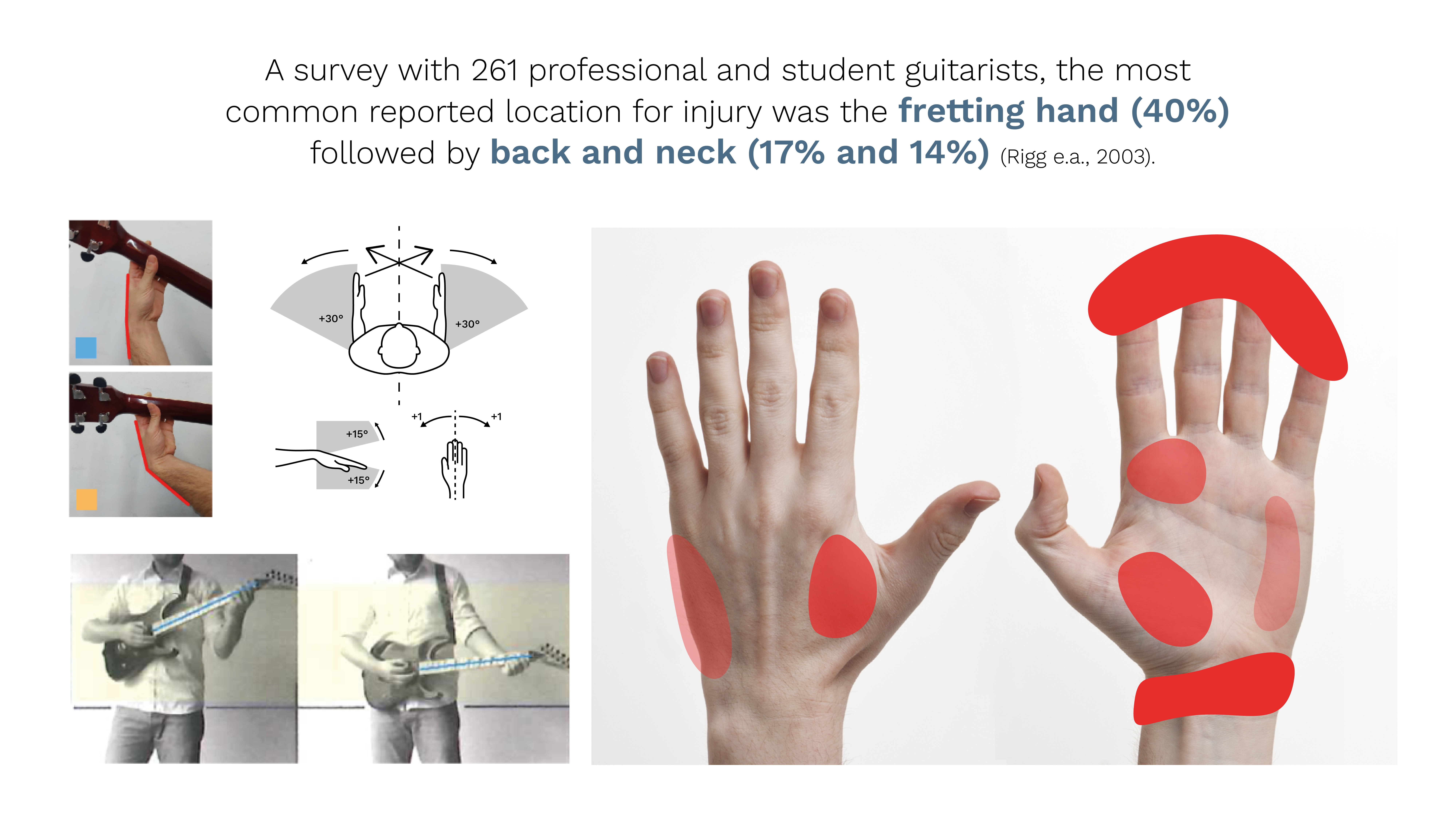המחקר העלה שאופי הנגינה של גיטריסטים יוצר אחוזים גבוהים של פציעות בעיקר כתוצאה מעומס יתר על שרירי הגוף אשר מופעלים בזמן הנגינה, ובנוסף שימוש לא נכון בכלי וחוסר תמיכה מהצד (מורה שיודע להנחות נגינה נכונה).