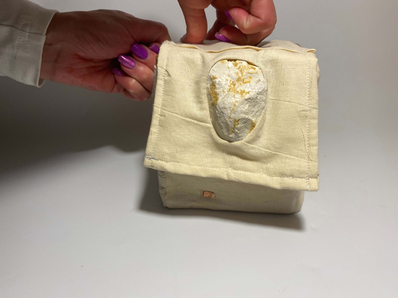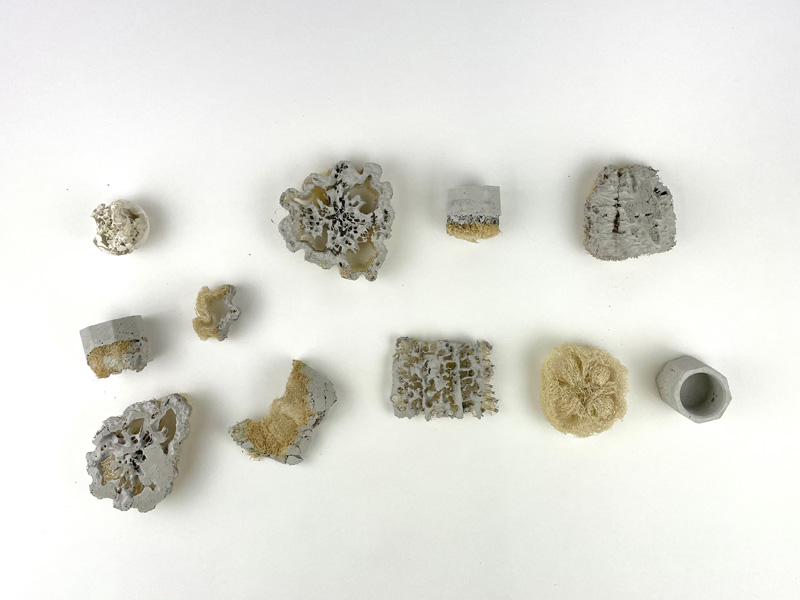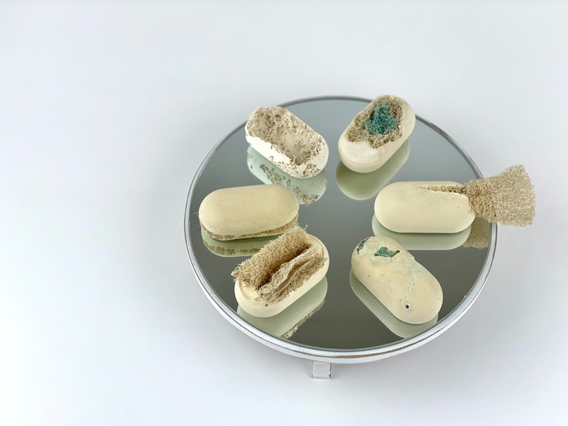 In our project, everyone shared their impression of Grandmother Hanna and from there we began considering objects. We conducted materials research to find materials that express her uniqueness. This is how we selected plaster and concrete (white, solid, clean) and a bath sponge (primal, airy, and formless). Using a fixed mold, we created plaster casts and tried to create a language with the sponge: depth, inclusion, history, meaning, modesty, and pride. All these describe Hanna's uniqueness.