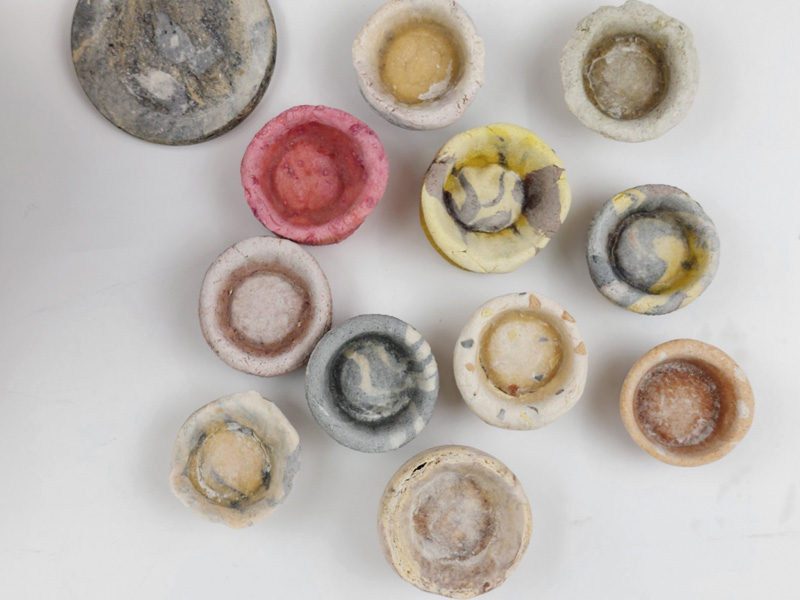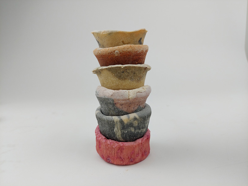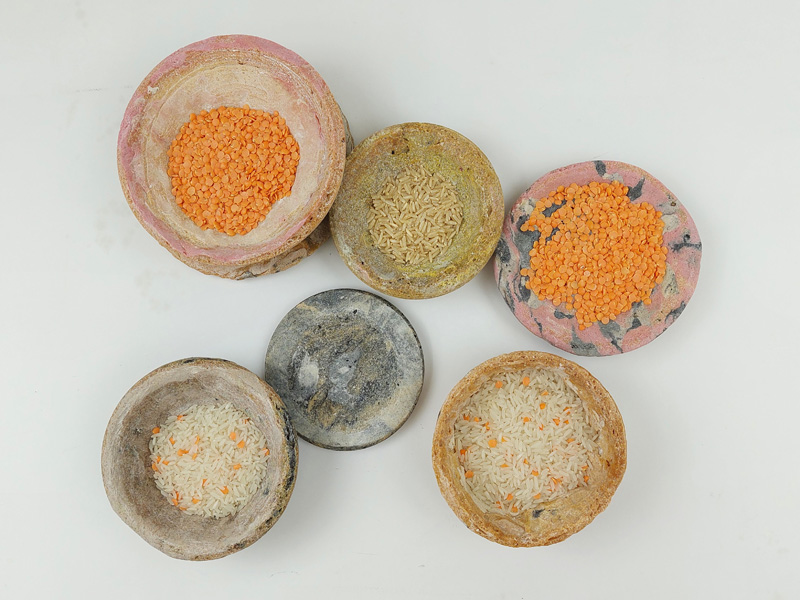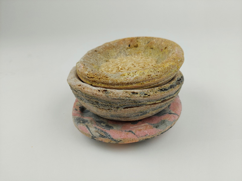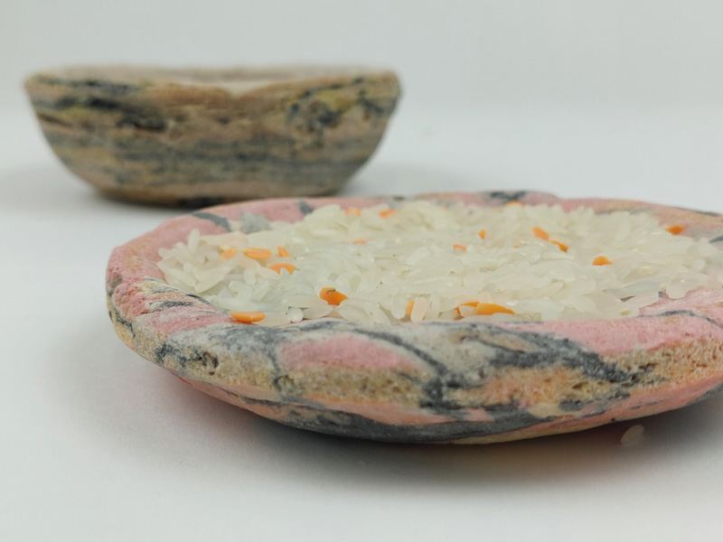 My father always loved to work with his hands, and one of his central interests was wood engraving. He engraved an impressive series of bowls. In this project, I wanted to explore how materials that are not wood can be etched or engraved and what results this would produce. After an exhaustive study of many materials, I chose dough, made of flour and salt and dyed with only natural pigments. After long baking, I etched the dough to make different sized and shaped bowls. The result is set of alternative eco-friendly dishes with a particularly raw design reminiscent of the bowls my father created.