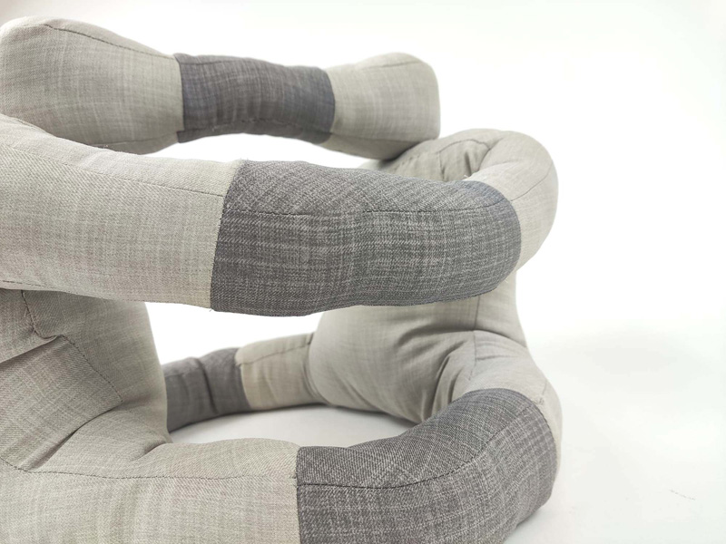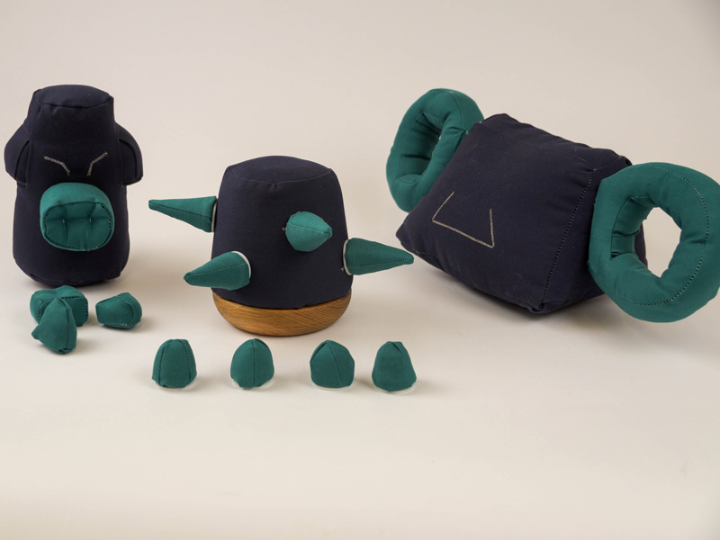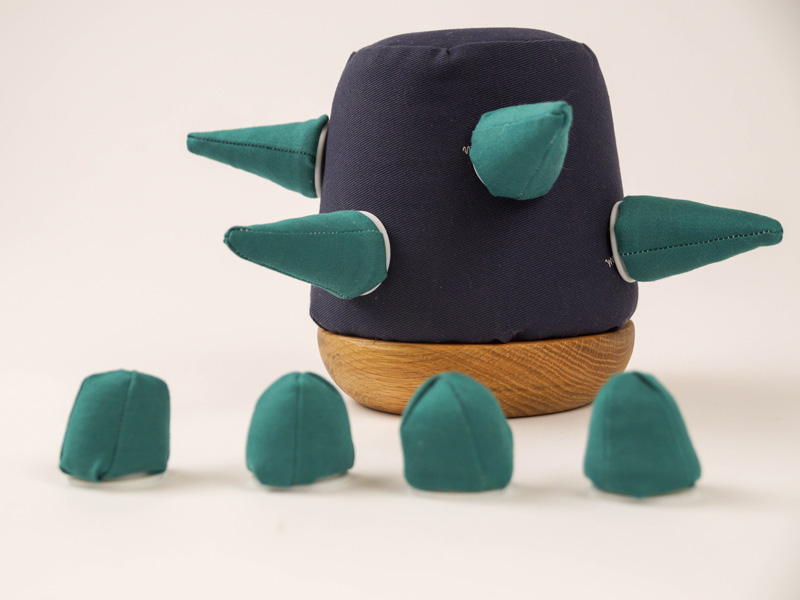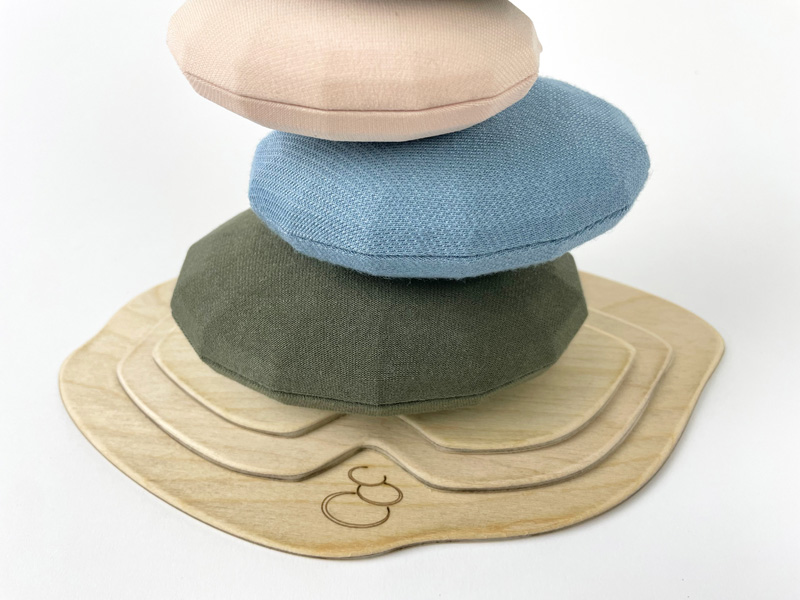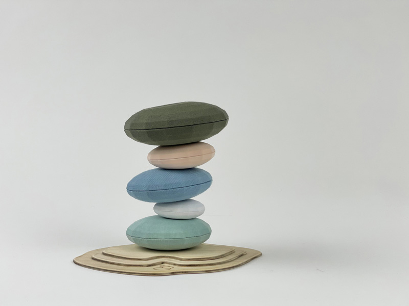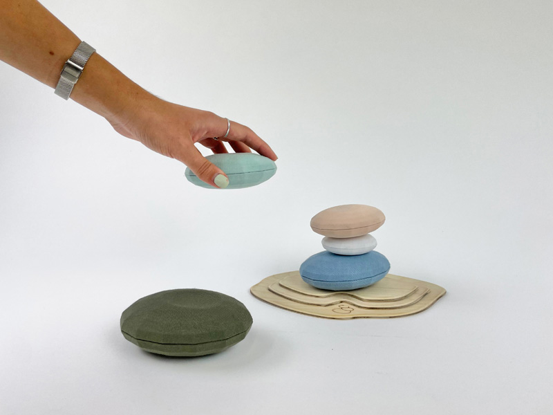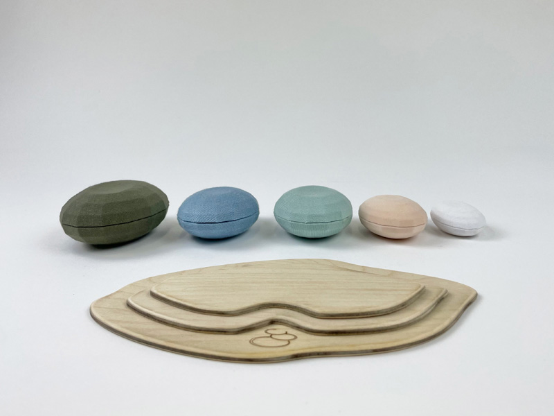 Tactile game for children's room at home or for clinic therapy rooms. Play pieces with 3-D printed fabric lining inspired by the shapes and color in nature. Shaped like pebbles with specially designed indentations that allow for piling them in various ways. Rujumix provides the clam of nature in your own office.