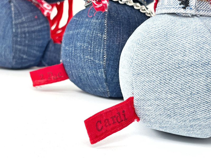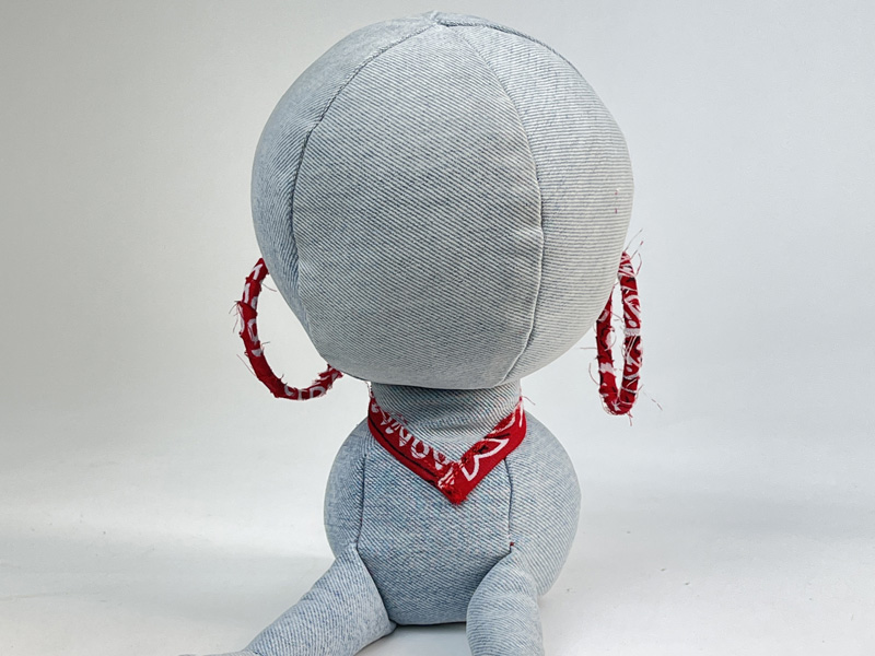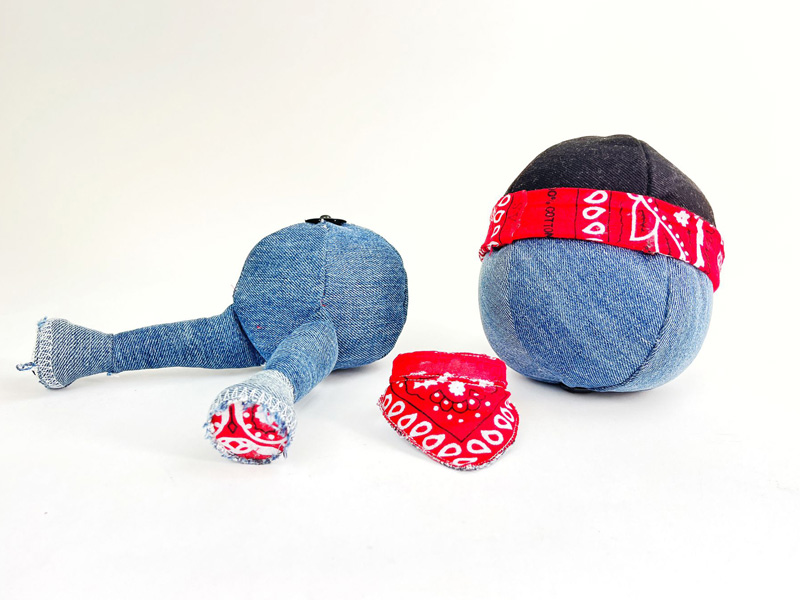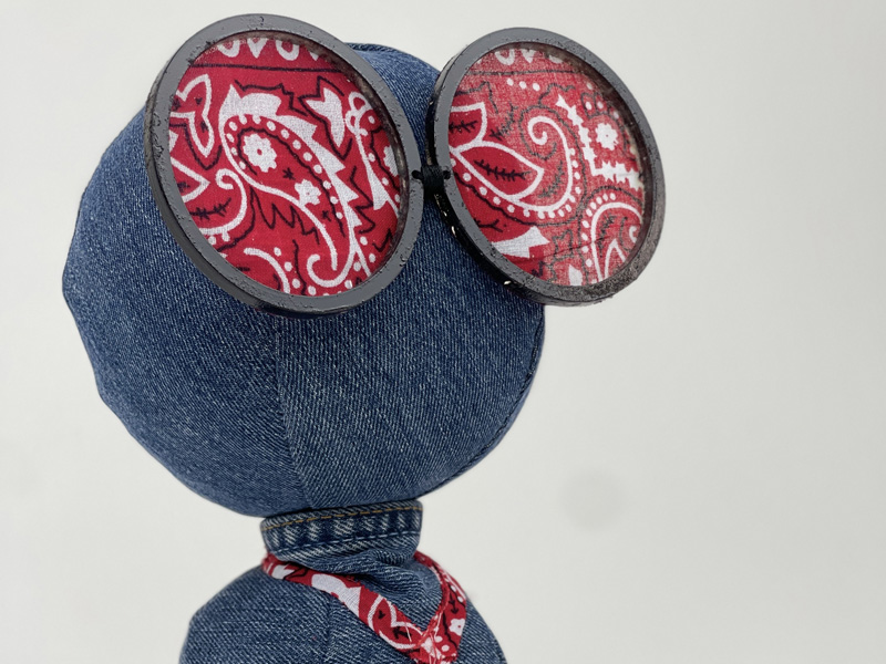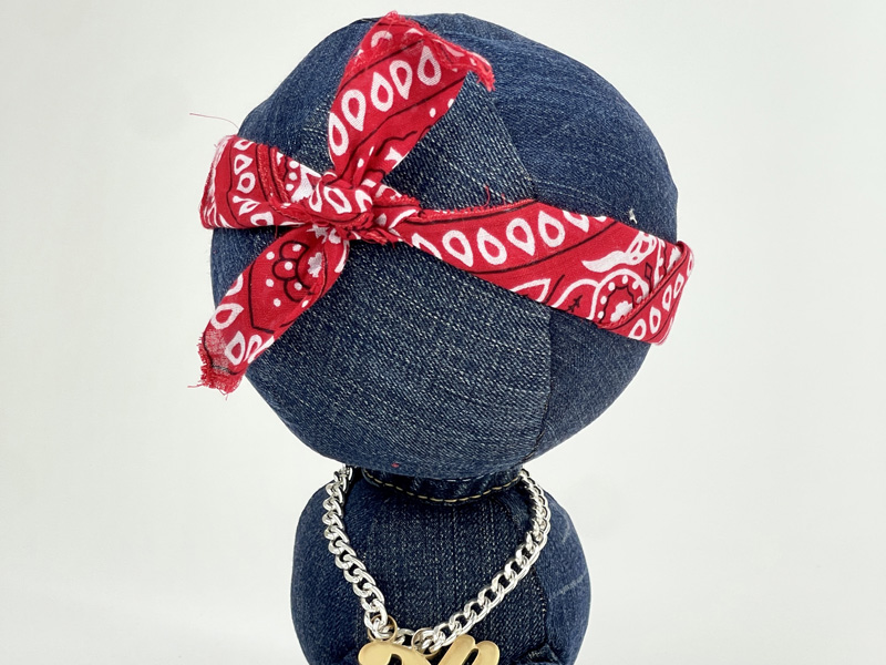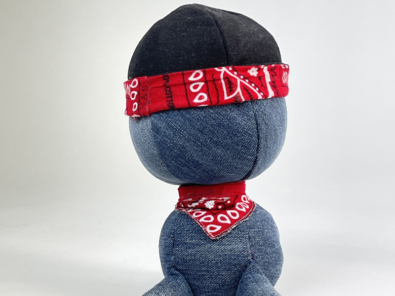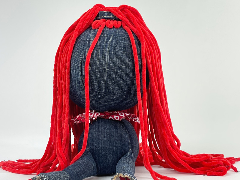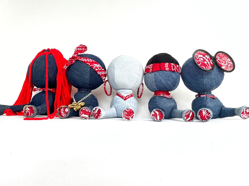 We used original Levi jeans that were about to be thrown away and bandanas with different knots associated with gang members and hood residents, making them affordable on any budget. The dolls have their own accessories and all are versatile in that they are attached using snaps that can be opened/closed and used in any way you can imagine. The name we selected has three O letters, symbolizing the recurrence of this letter in our names, giving us all our individual mark and our connection as a group.