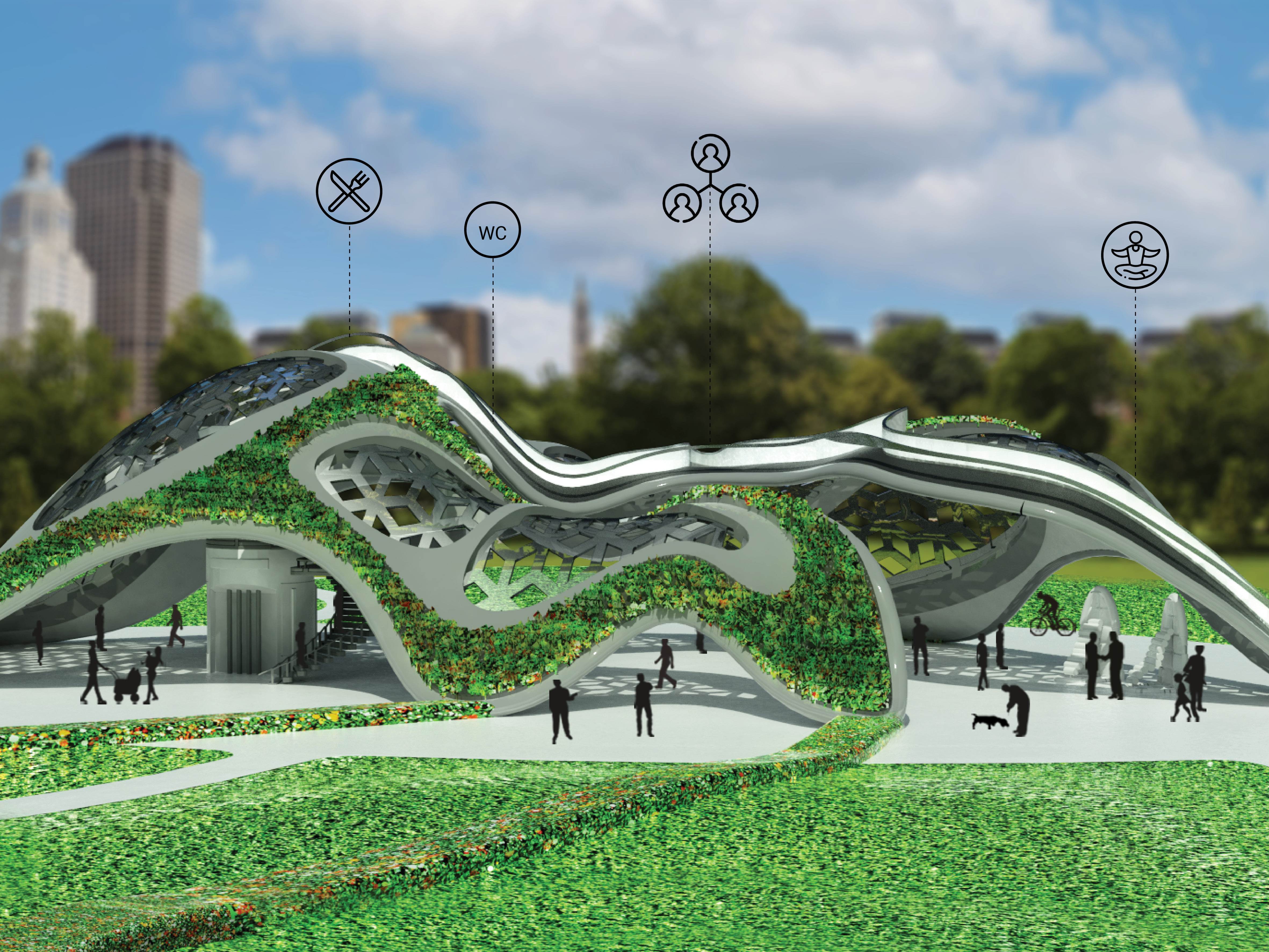 Design and planning of a multi-purpose structure in parks, integrating the park's vegetation into the building, and using it in all its dimensions for leisure activities. It is accessible to the elderly and intended for all ages.