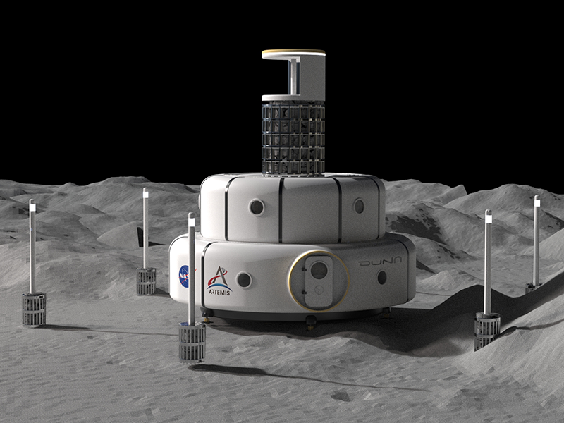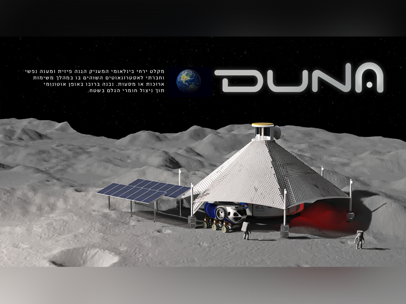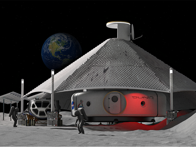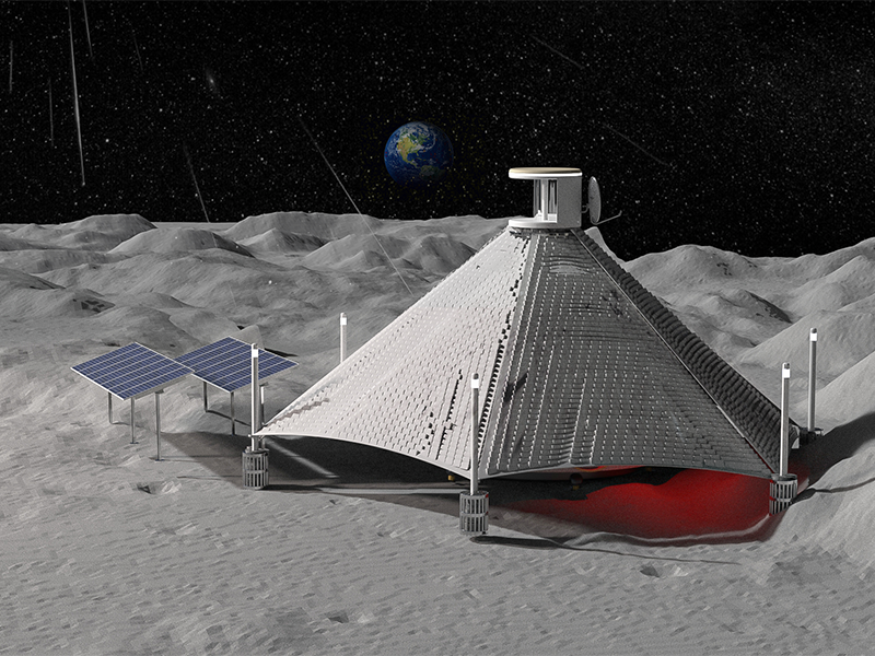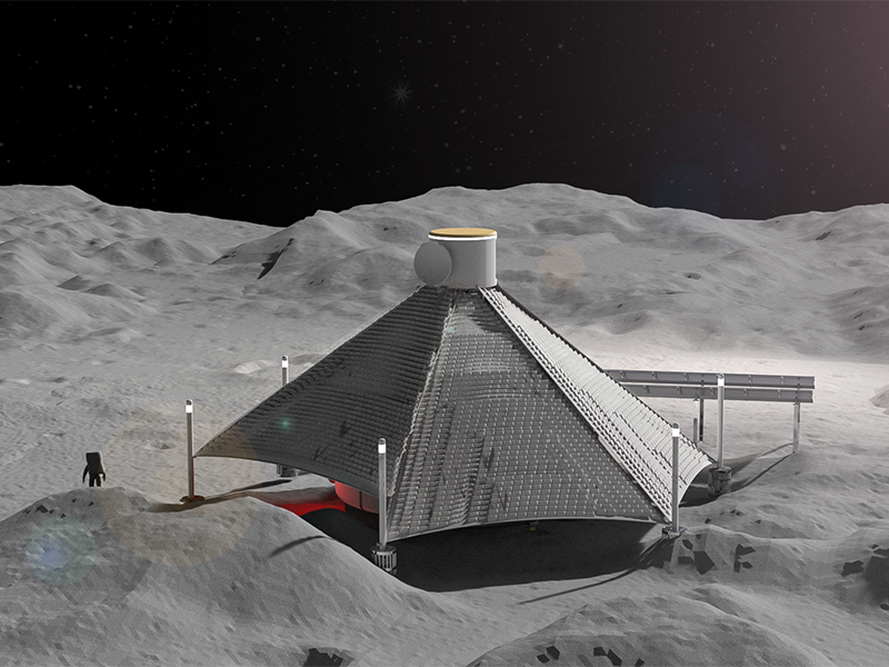 A shelter for astronauts on the moon, built autonomously while making maximum use of materials found at the construction site.