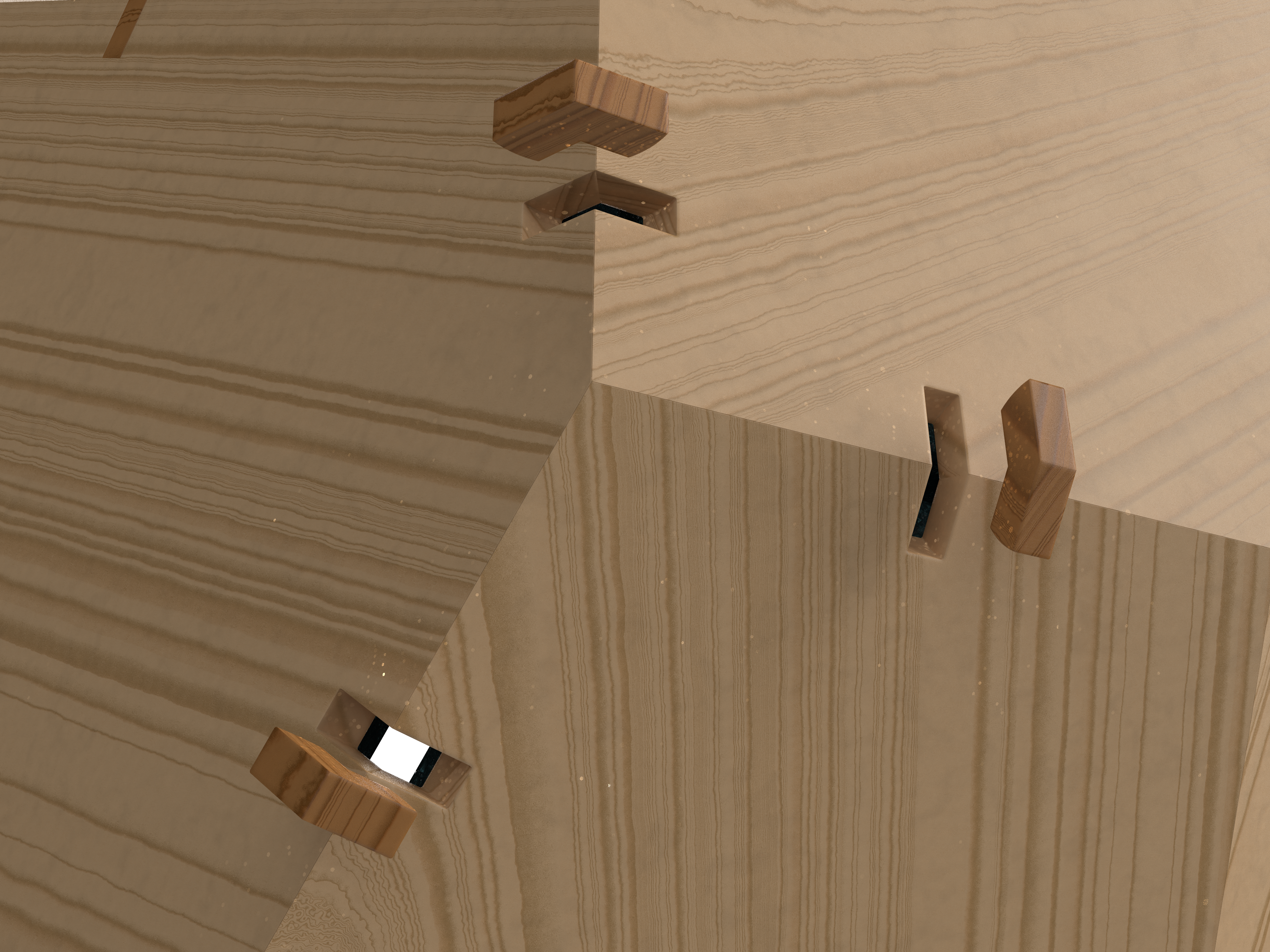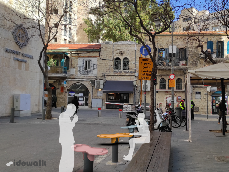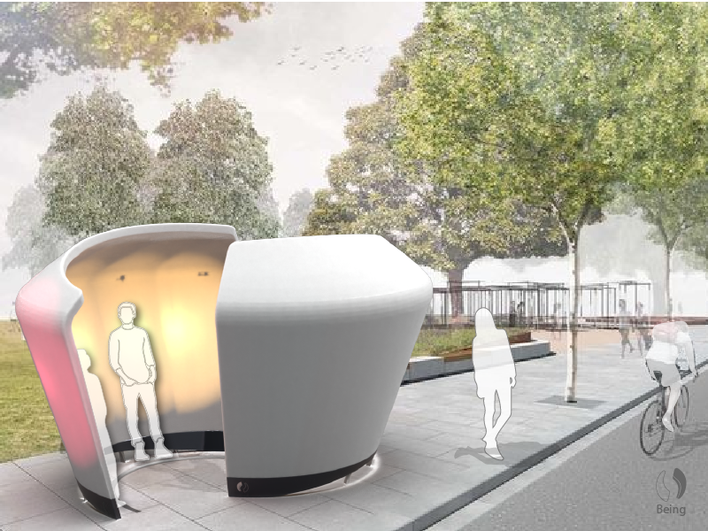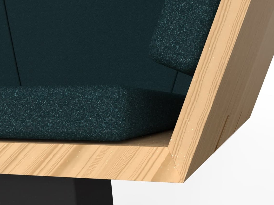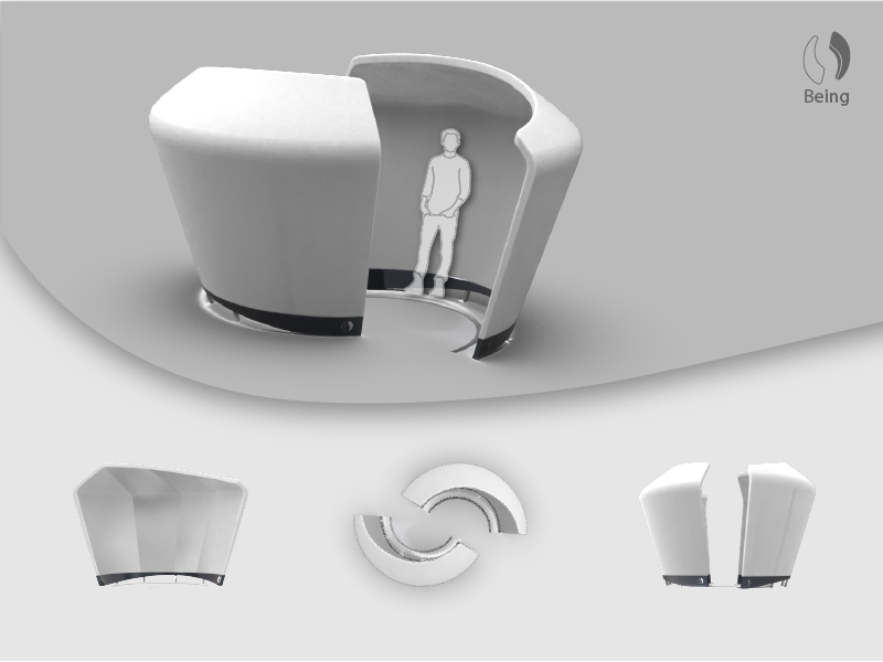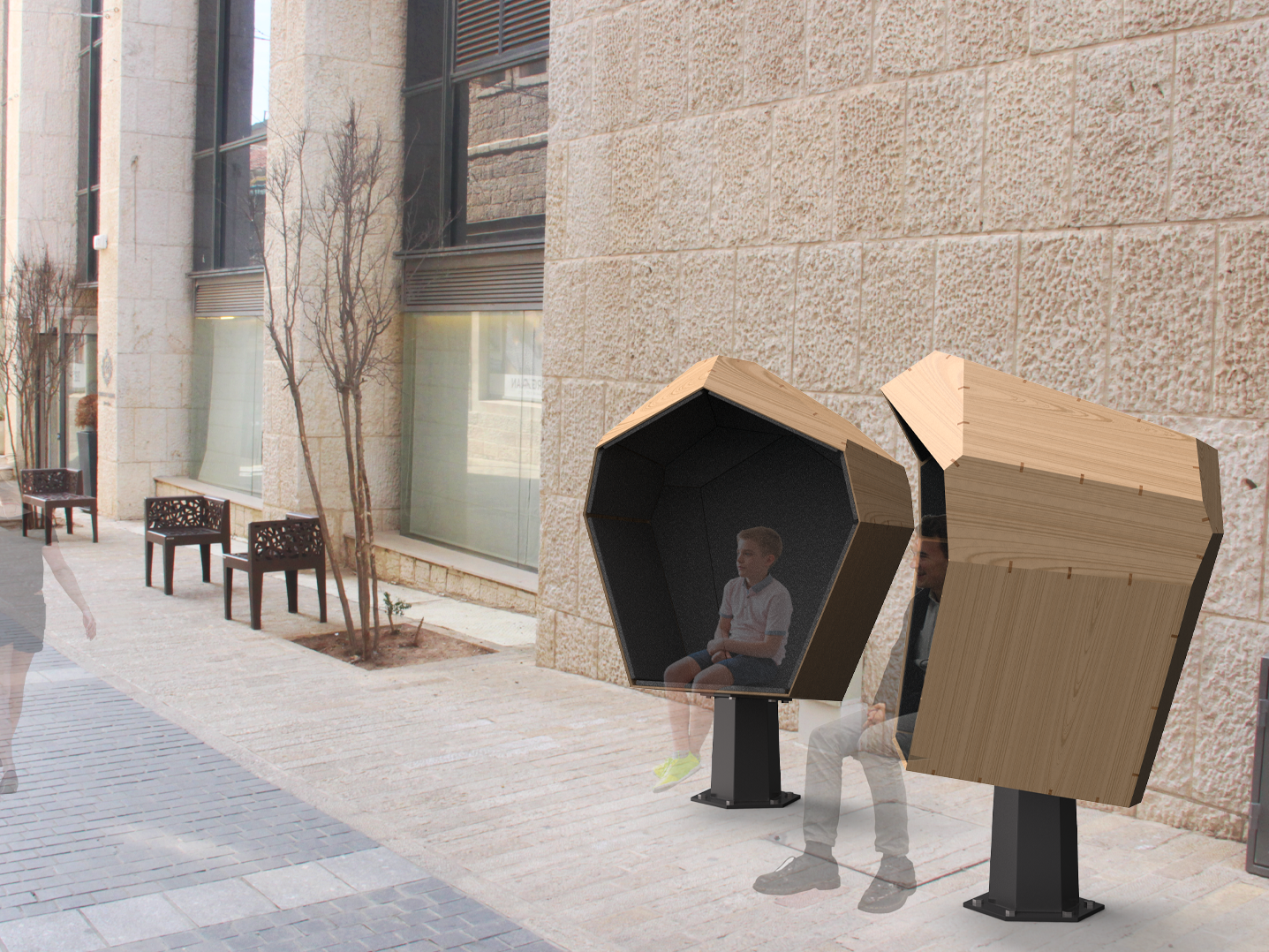 Creating a quiet space that is a temporary shelter within the public space by placing seating structures that reduce background noise. A street-adapted piece of furniture made of wooden boards connected to each other by wooden lugs, which complement a polygonal shape, attached to the floor with a hexagon-shaped steel pillar to preserve the polygonal structure.