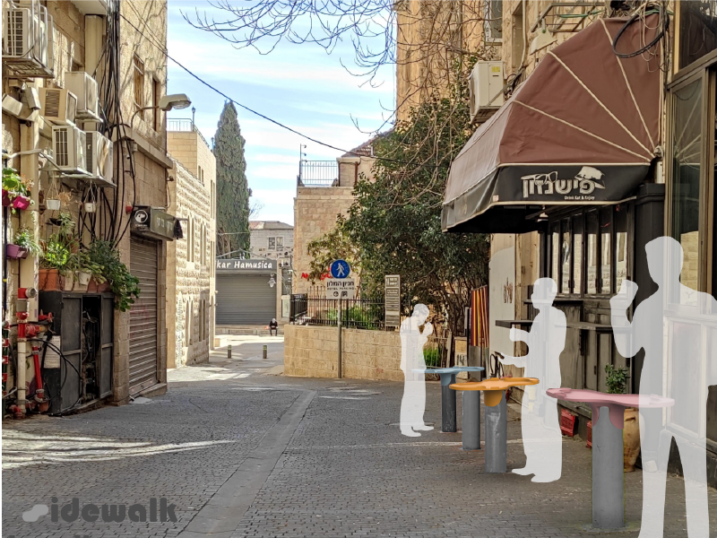 An outdoor dining table adapted to the Corona period that is put together on existing pillars in the street and creates a new dining experience.