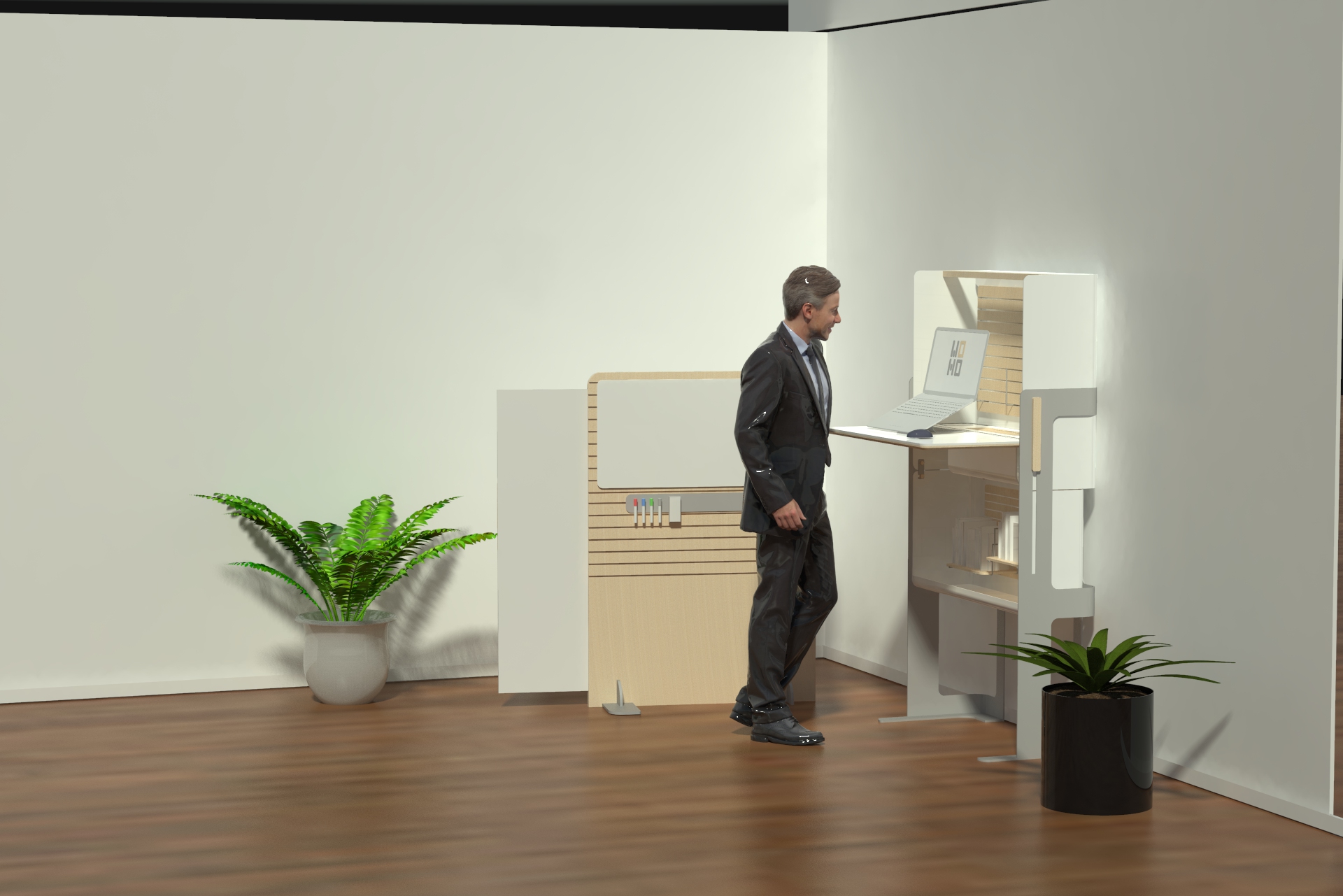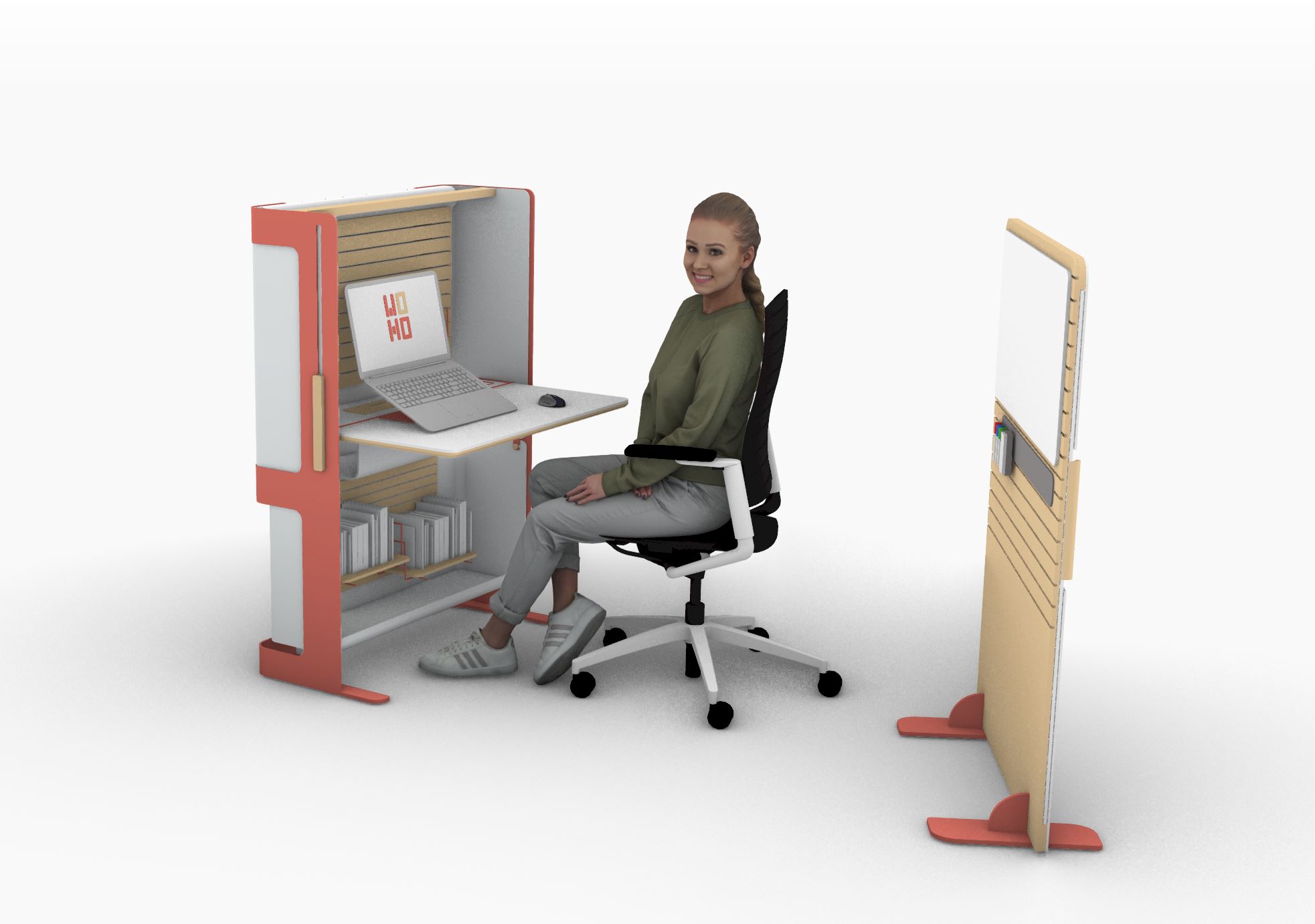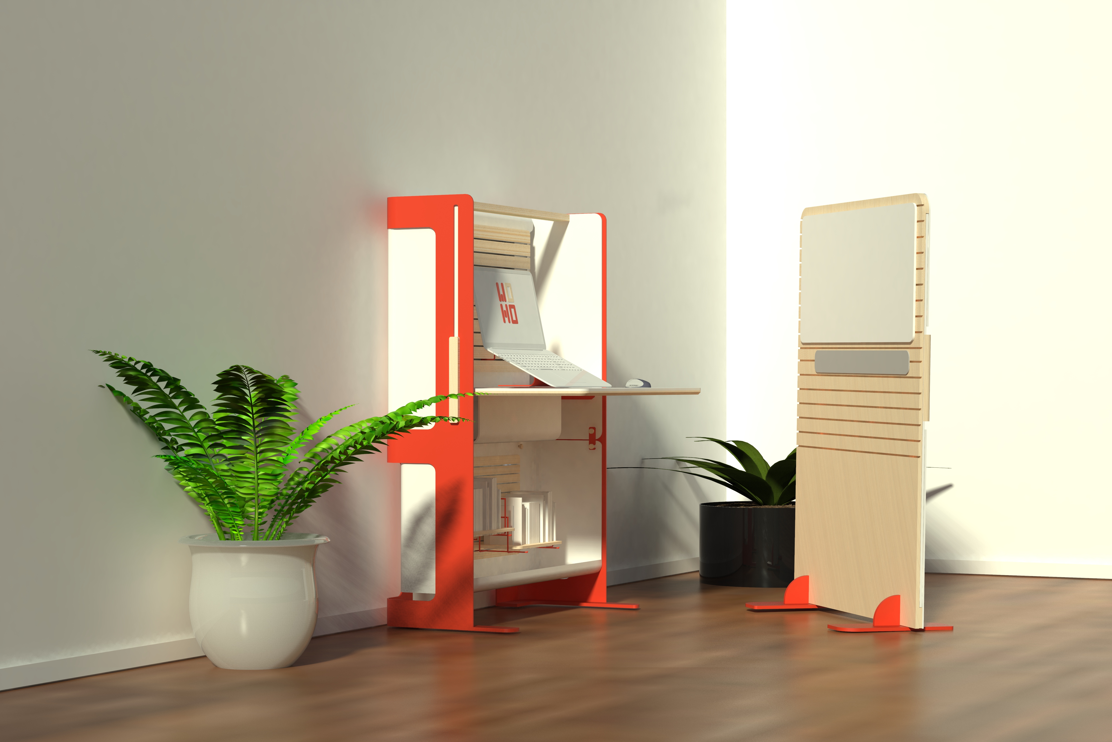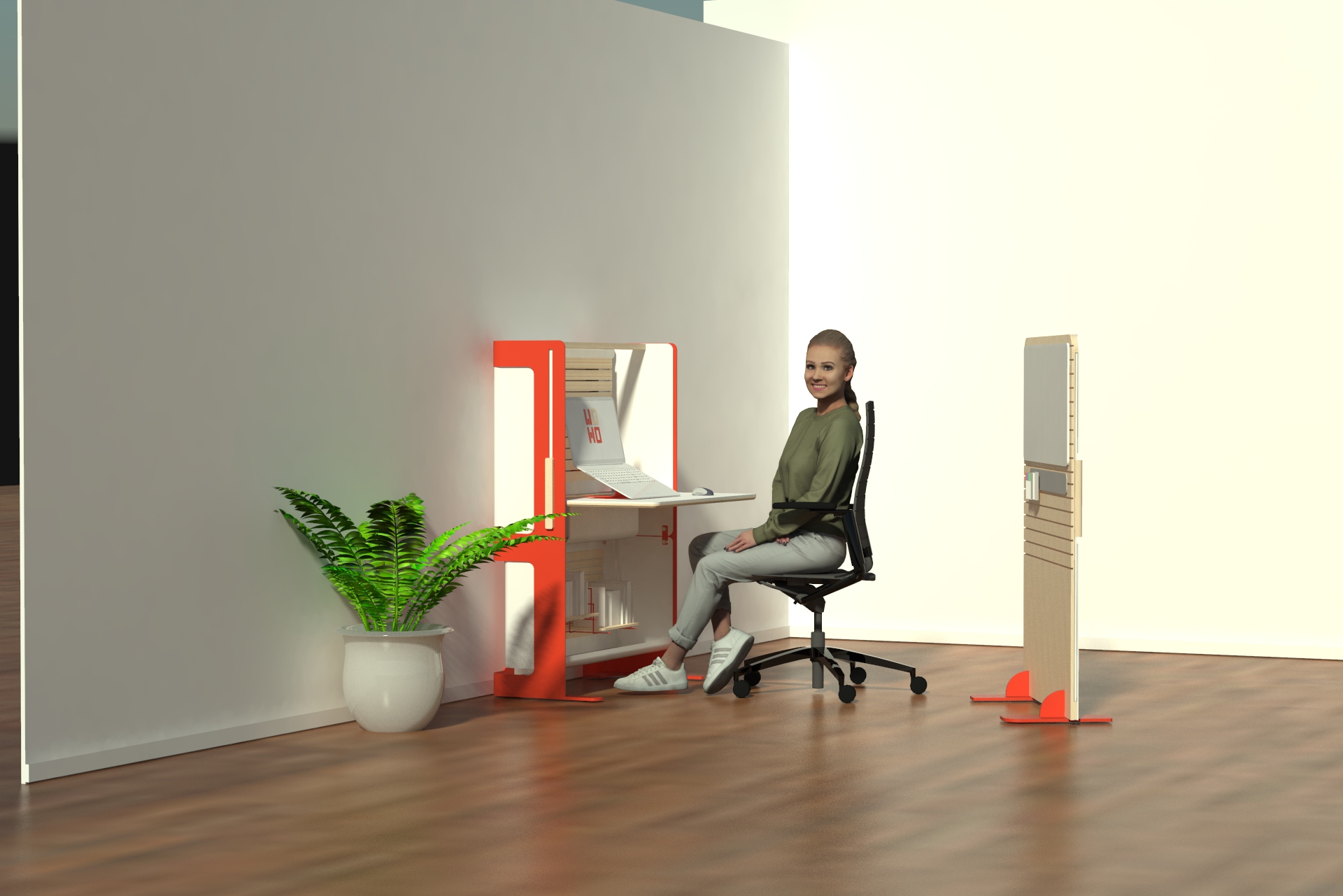 A workstation makes it possible to make optimal use of the home space for occupational needs, without the need to allocate a designated area that interferes with routine conduct in the home space and in private life. The station allows the use of three modes - open/closed/insulated. Each of the modes is designed to serve the different needs of the different users in the same space.