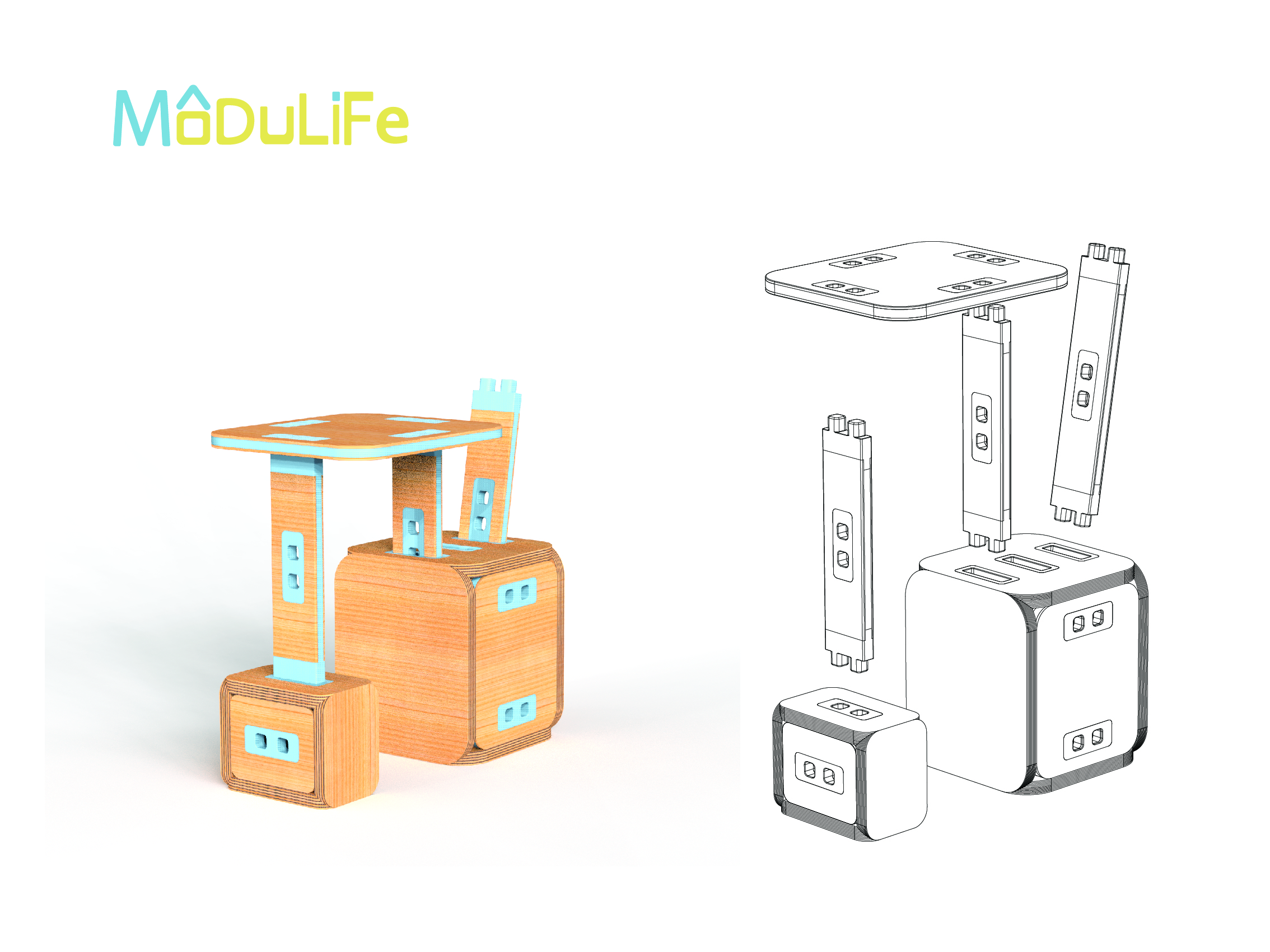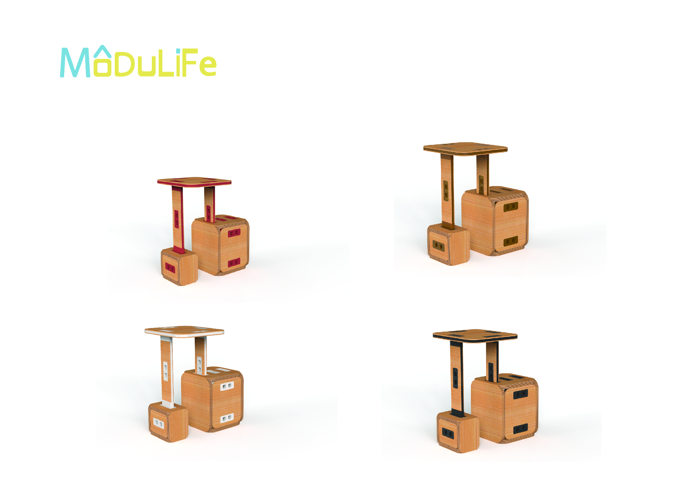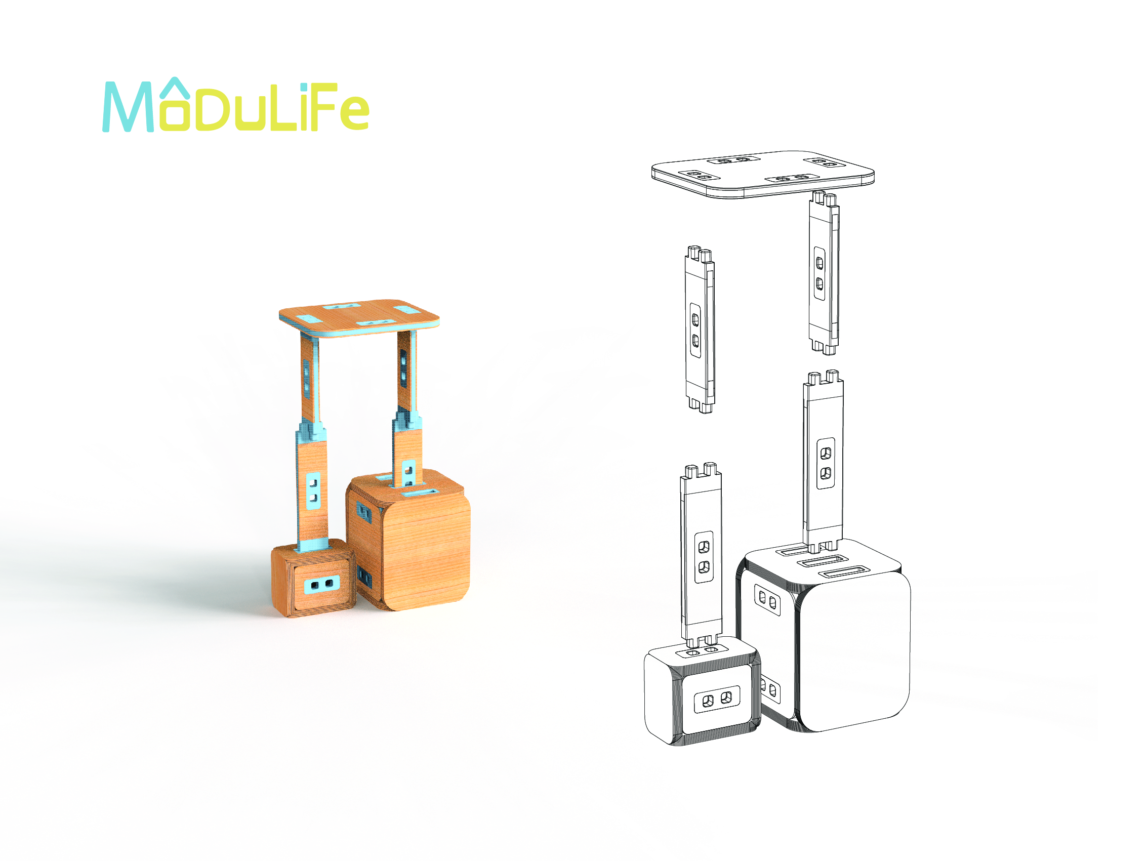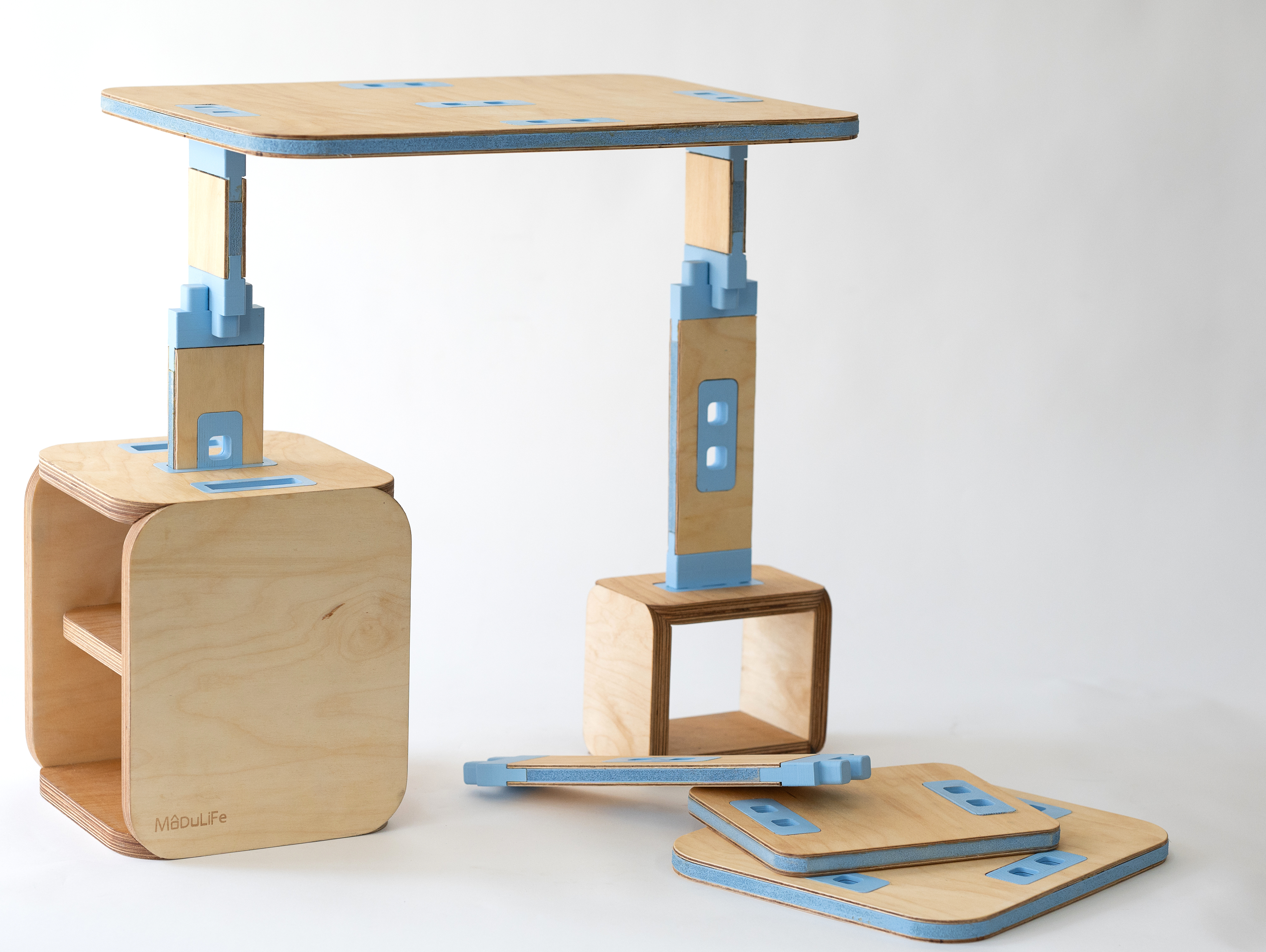 MODULIFE   בנויה מיחדה מרכזית עשויה עץ ומאפשרת בסיס יציב לבנייה של תצורות שונות על גביה. אליה מתחברים חלקים קלי משקל המאפשרים מגוון מתוכנן של תצורות החל משולחן סלון, שרפרף עבודה לילדים, סטנד עבודה, כסא נמוך וכסא גבוה ועוד אין סוף אפשרויות שטרם גילינו.