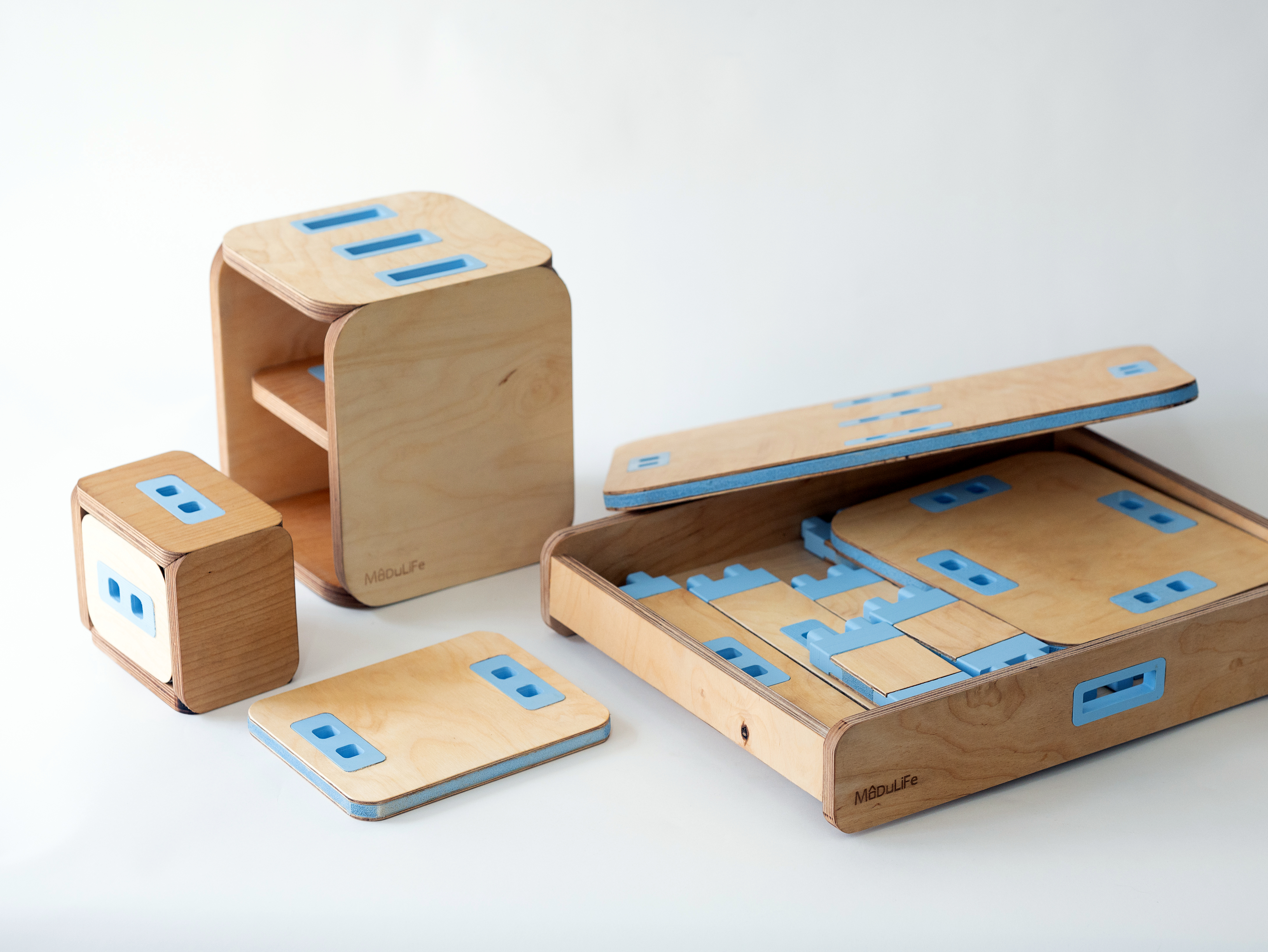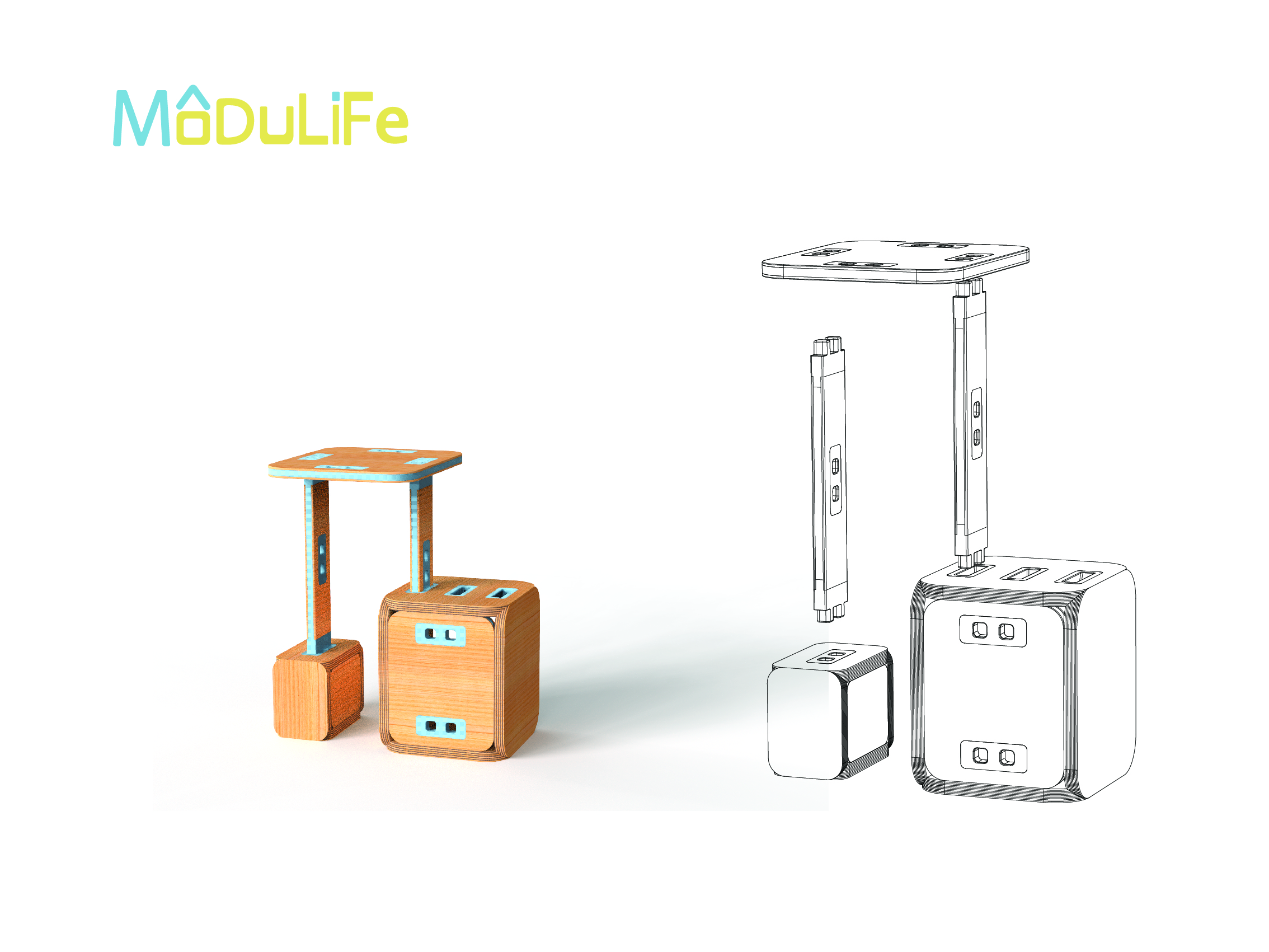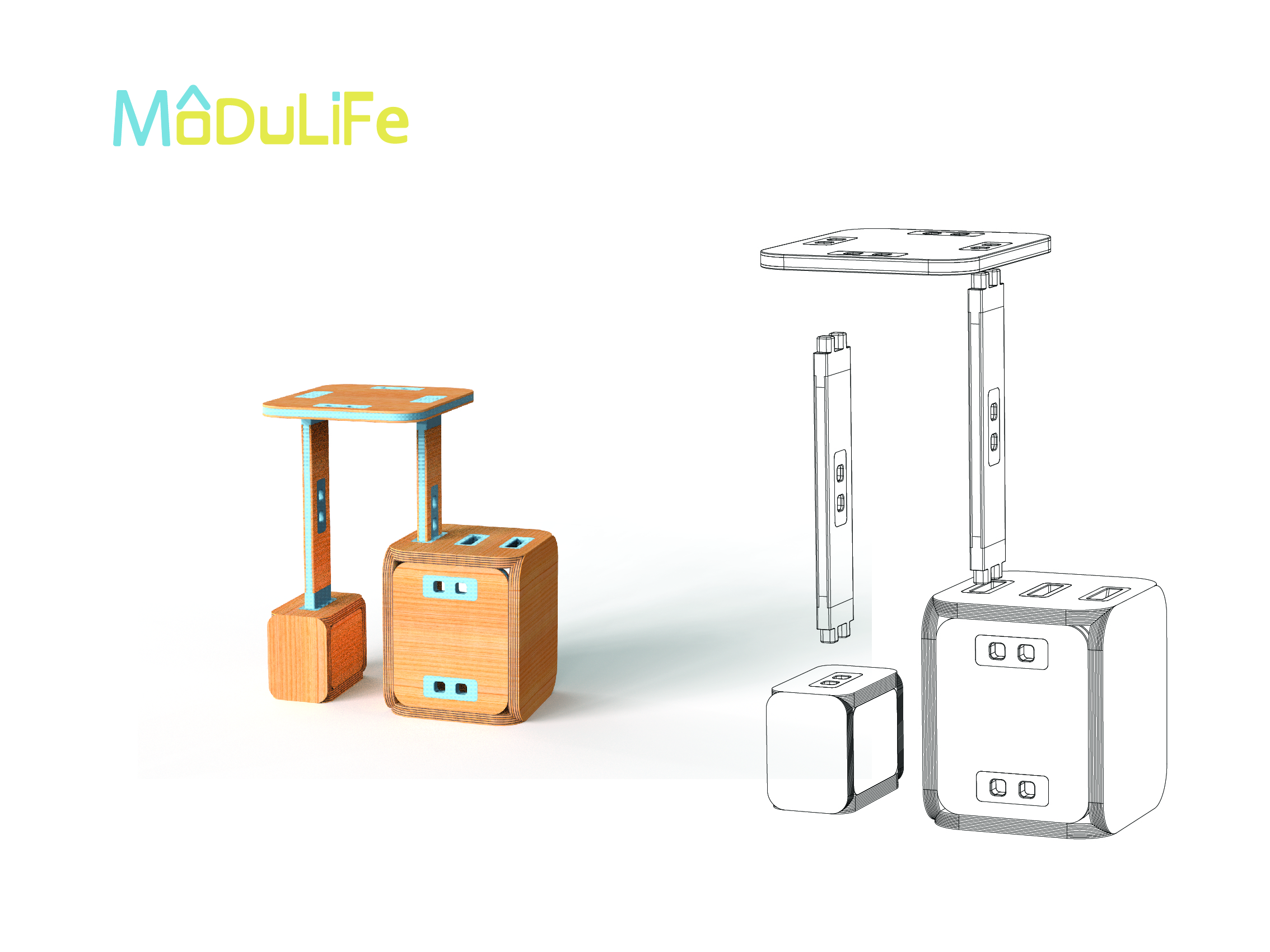 MODULIFE   בנויה מיחדה מרכזית עשויה עץ ומאפשרת בסיס יציב לבנייה של תצורות שונות על גביה. אליה מתחברים חלקים קלי משקל המאפשרים מגוון מתוכנן של תצורות החל משולחן סלון, שרפרף עבודה לילדים, סטנד עבודה, כסא נמוך וכסא גבוה ועוד אין סוף אפשרויות שטרם גילינו.