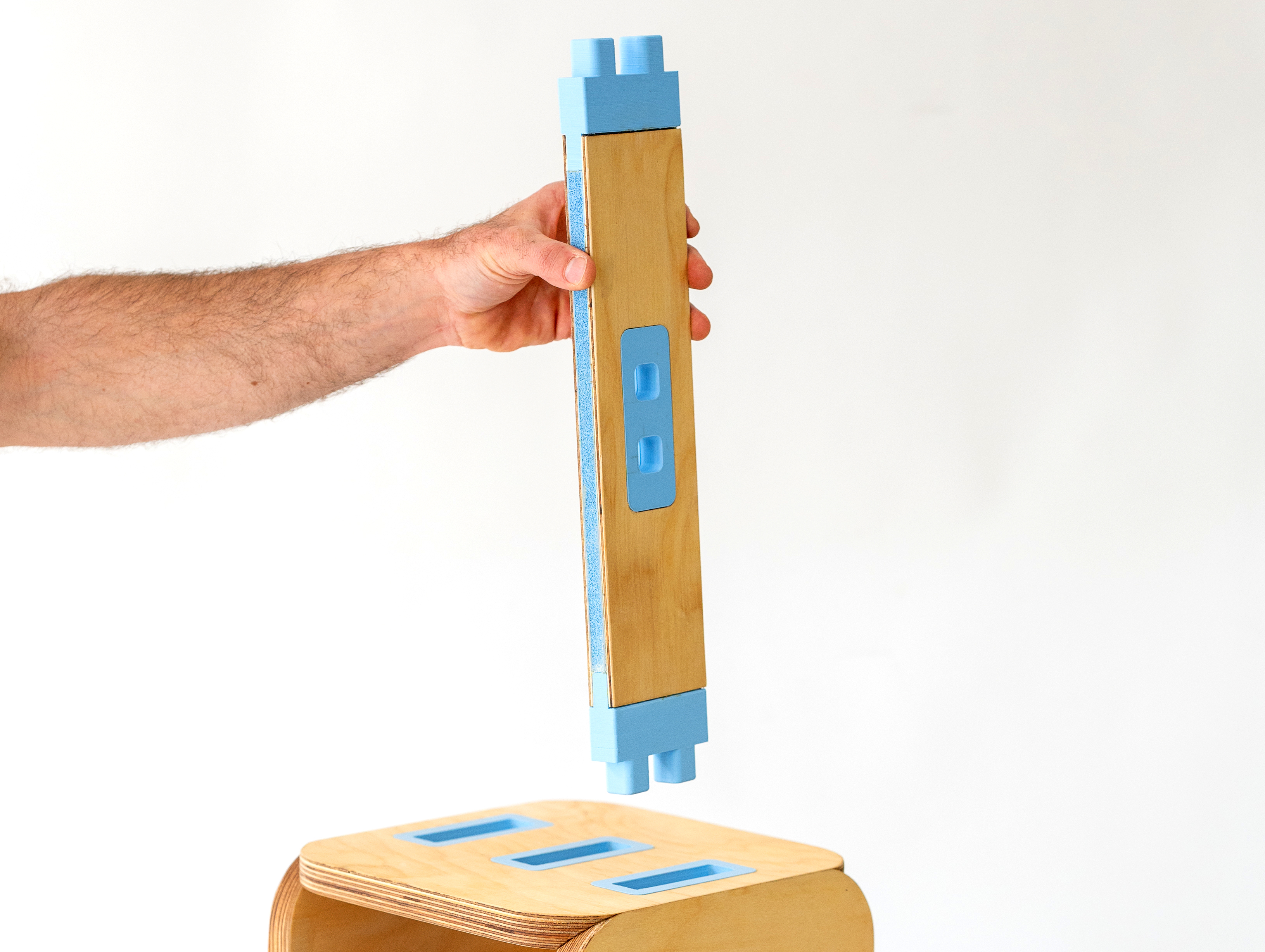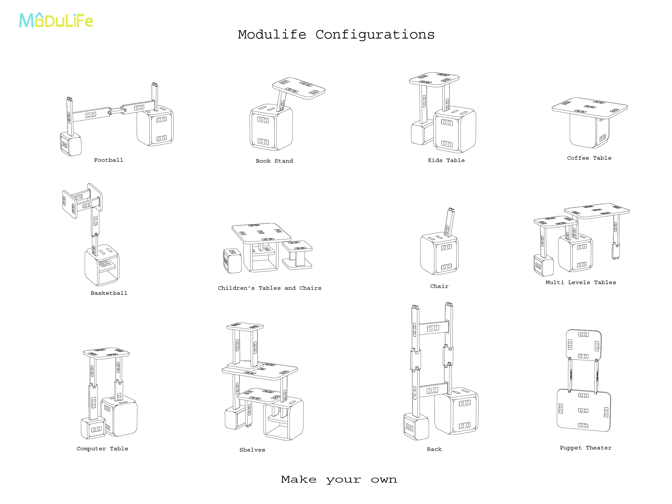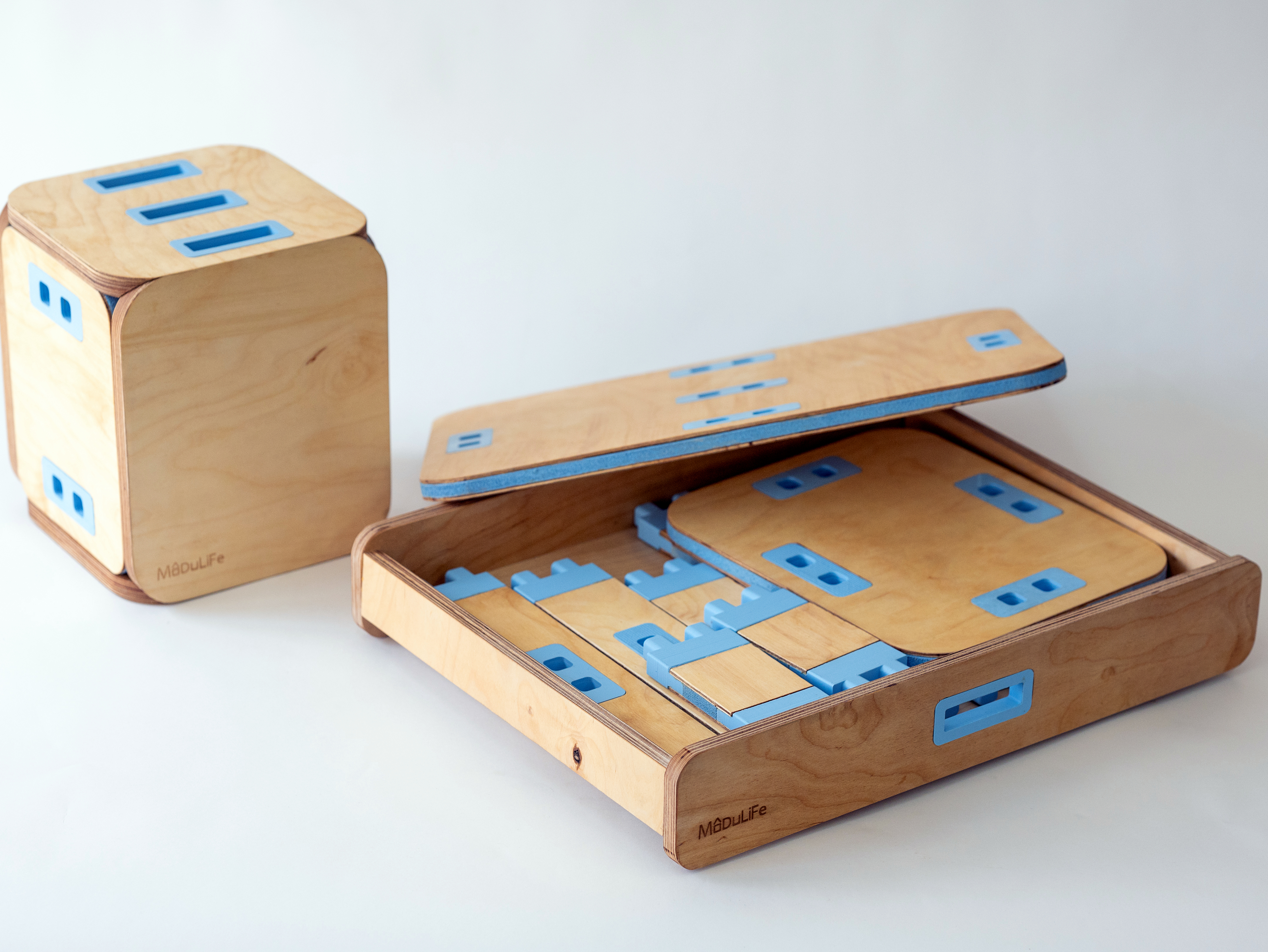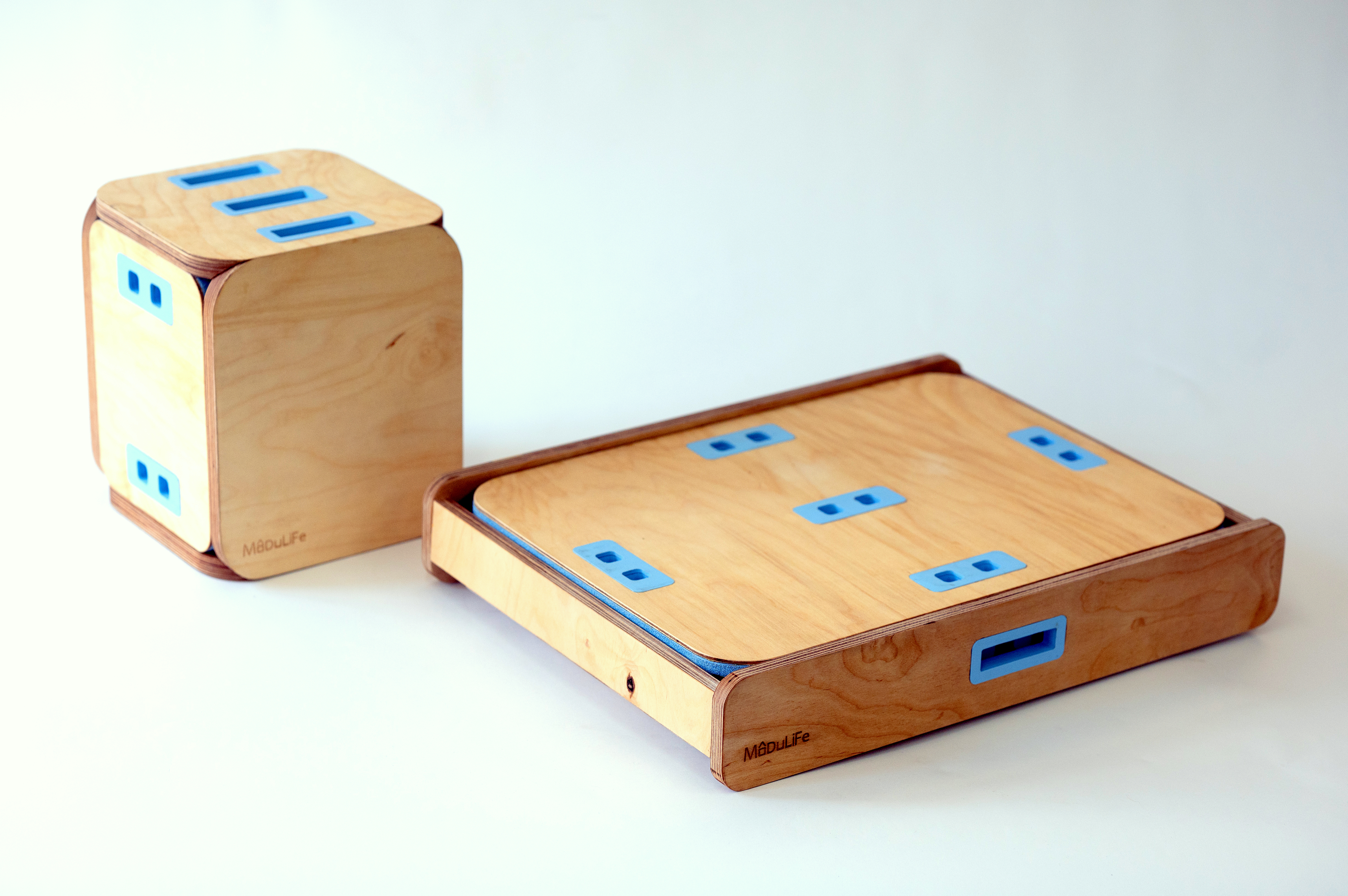 MODULIFE   בנויה מיחדה מרכזית עשויה עץ ומאפשרת בסיס יציב לבנייה של תצורות שונות על גביה. אליה מתחברים חלקים קלי משקל המאפשרים מגוון מתוכנן של תצורות החל משולחן סלון, שרפרף עבודה לילדים, סטנד עבודה, כסא נמוך וכסא גבוה ועוד אין סוף אפשרויות שטרם גילינו.