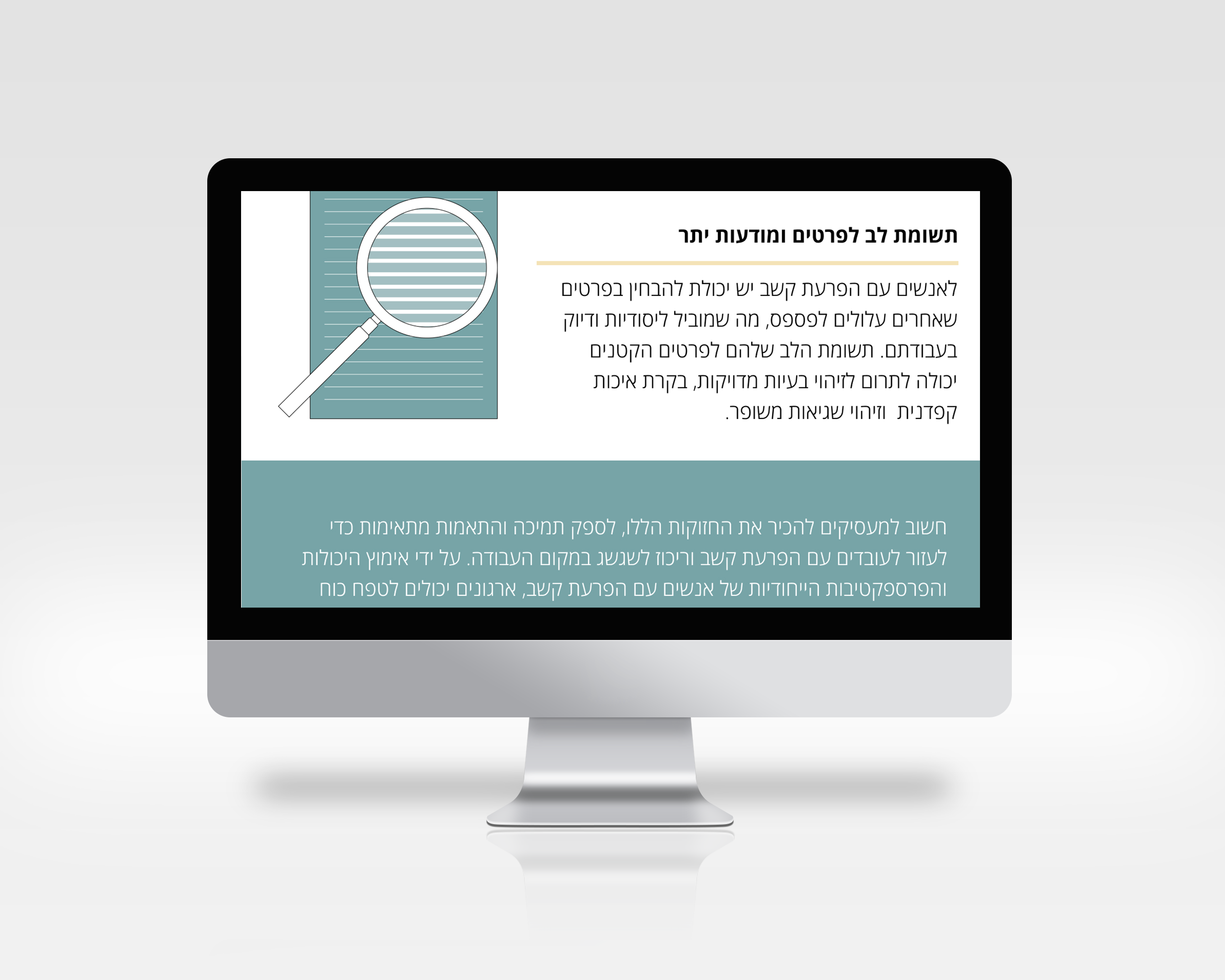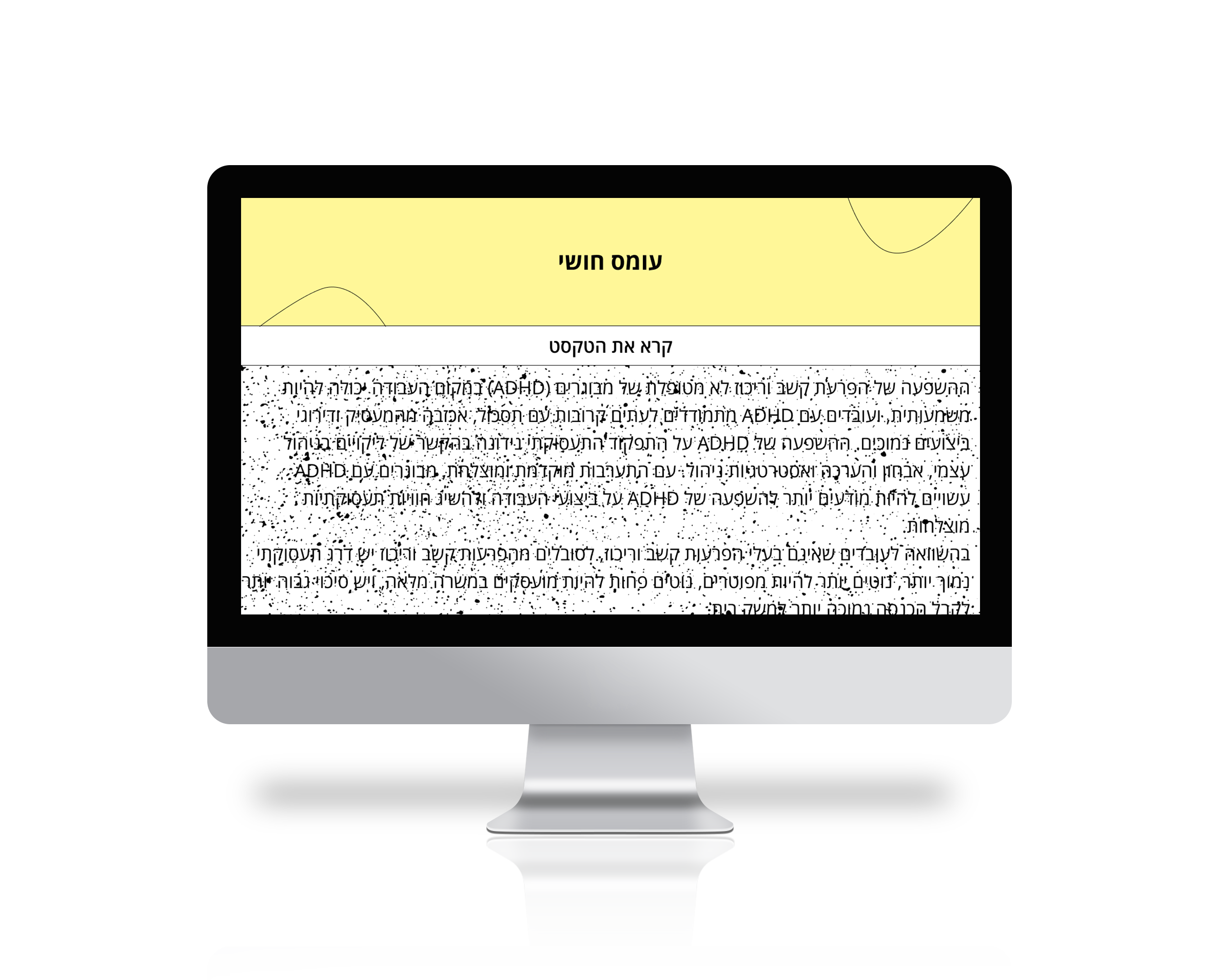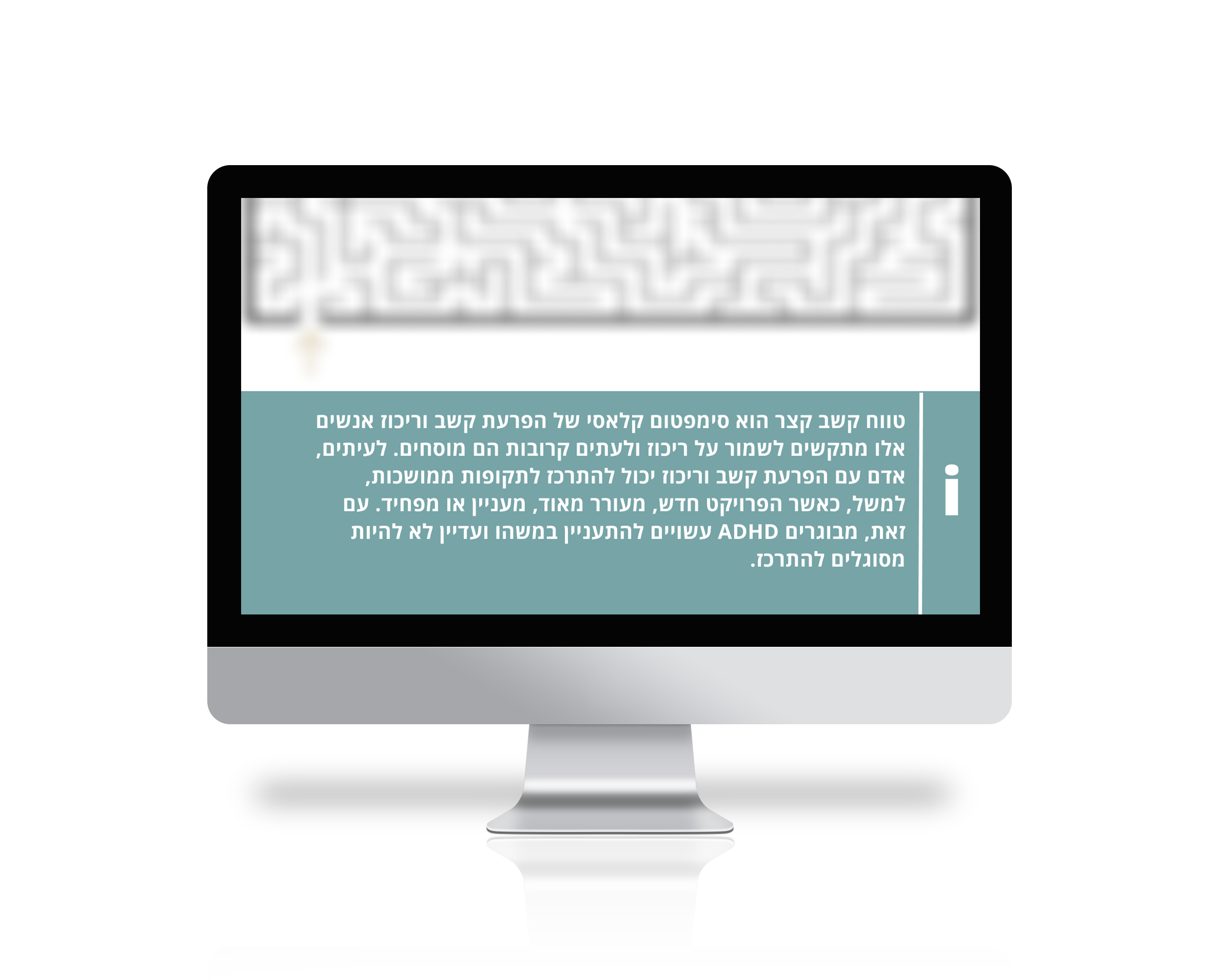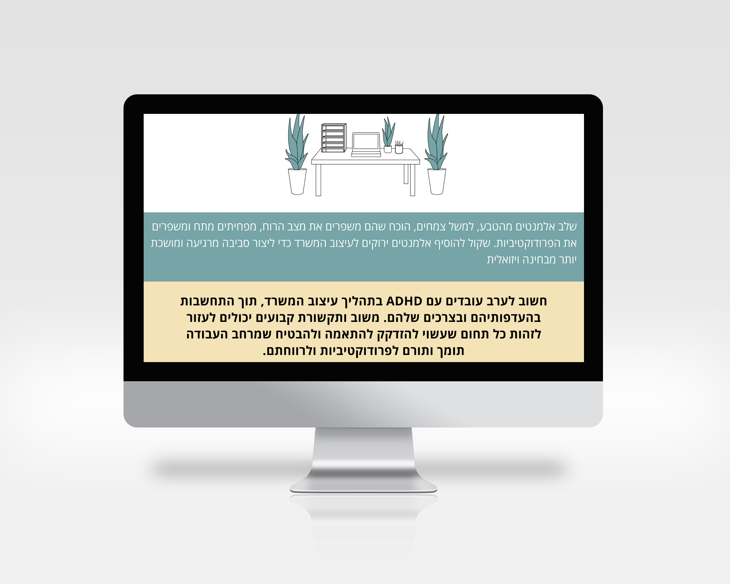 - ADHD-ON הוא אתר מקיף שנועד לתמוך, לספק מידע ואסטרטגיות למעסיקים לצורך יצירת סביבת עבודה מכילה ופרודוקטיבית, על ידי הבנת הקשיים הספציפיים איתם מתמודדים אנשים עם הפרעת קשב במקום העבודה. מעסיקים יכולים ליישם התאמות במקום העבודה כדי למקסם את הפרודוקטיביות והפוטנציאל של העובדים, מאסטרטגיות מותאמות ועד לשיטות עבודה מומלצות, האתר מספק שפע של ידע לתמיכה במעסיקים ביצירת אווירה מכילה ותומכת. בנוסף לחוויה אינטראקטיבית שמקדמת אמפתיה, מעסיקים יכולים לחוש ולחוות את הקשיים והיתרונות של אנשים עם הפרעות קשב ולפתח הבנה מעמיקה יותר של צרכי אנשים עם הפרעת קשב ולחוות את הקשיים והיתרונות מנקודת המבט שלהם ולפתח הבנה מעמיקה יותר של הצרכים שלהם. מטרת האתר היא לרתום את המעסיק על ידי האמונה שעם התמיכה וההבנה הנכונים, אנשים עם הפרעת קשב יכולים לשגשג בעבודה, ולתרום מכישוריהם וכישרונותיהם הייחודיים להצלחת הארגון הכוללת.