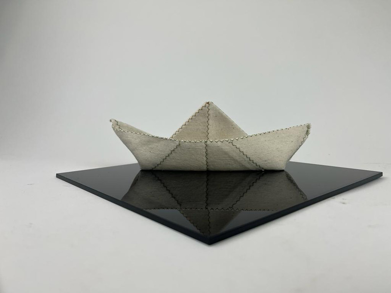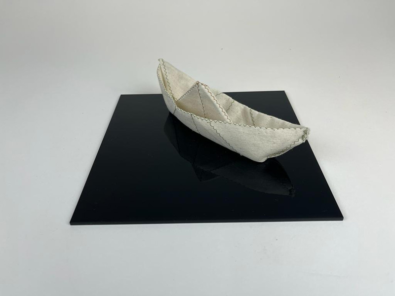סירת בד על משטח שחור עיצוב בד על ידי קיפול, חימום ותפירה. סירת נייר מהווה עבורנו סמל חזותי לאמפתיה, תקווה ונוסטלגיה.
