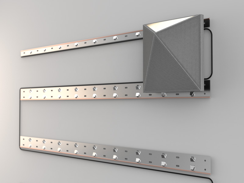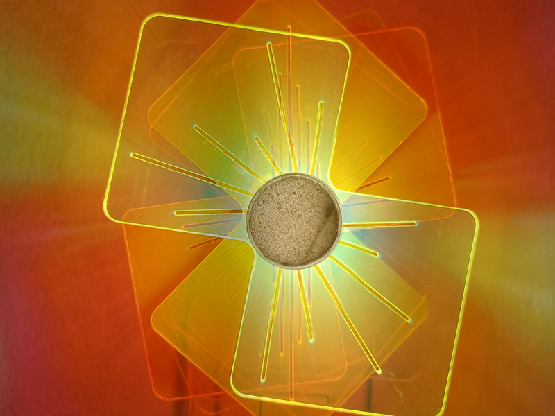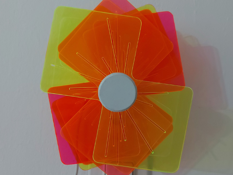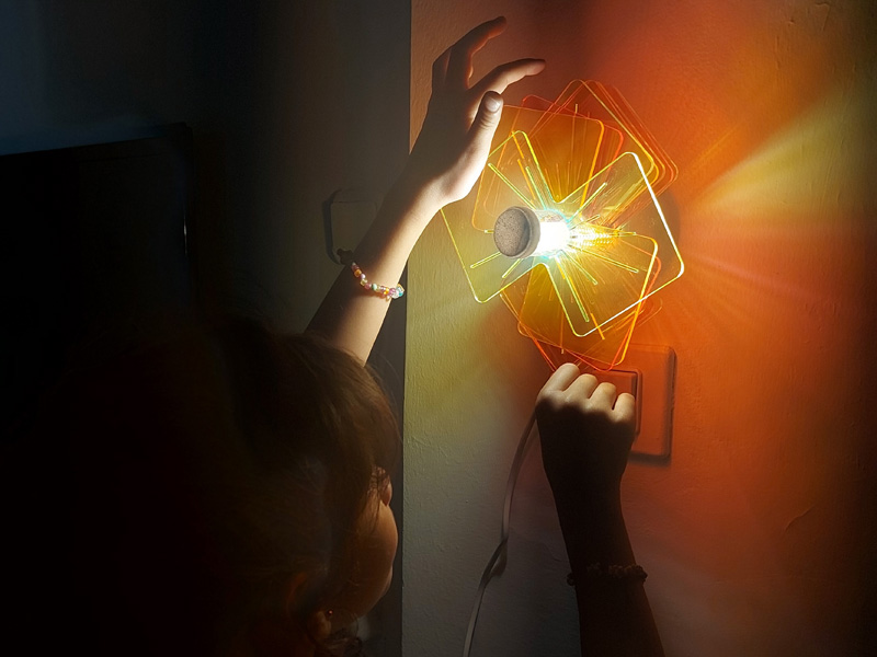 מנורת קיר אטרקטיבית לחדר ילדים. הנורה משמשת כציר מרכזי לחלקים המסתובבים. ע"י האור ותנועת החלקים, נוצר מופע של צבעים וצורות על הקיר.