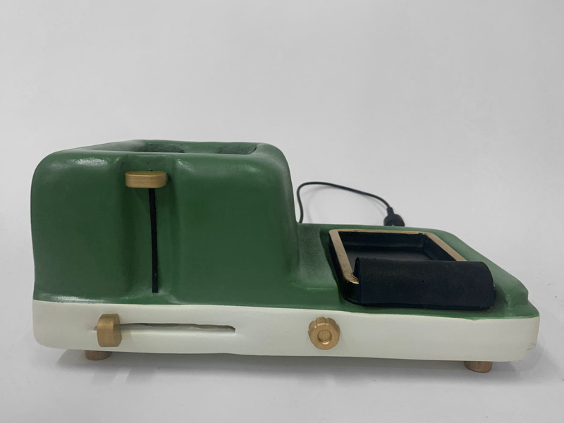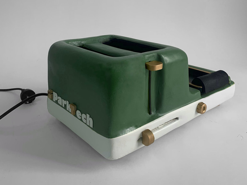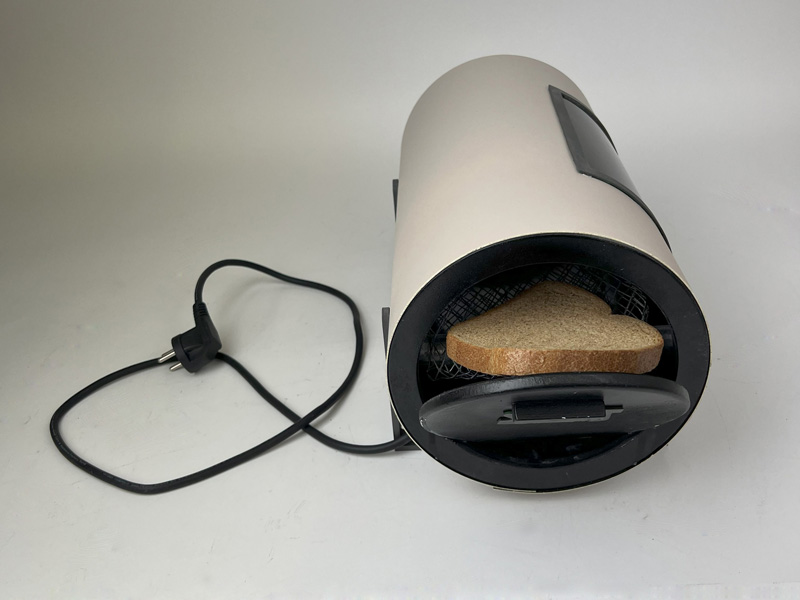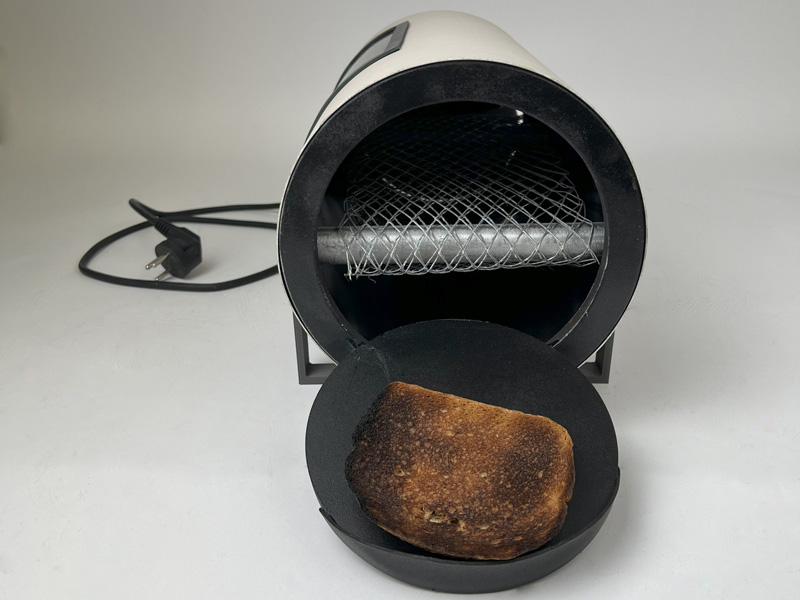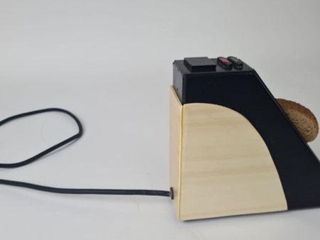 טוסטר המיועד לשימוש משרדי, בעל מסך LCD ומערכת שליטה מרחוק. עשוי פח ומחופה פלסטיק בדימוי עץ.